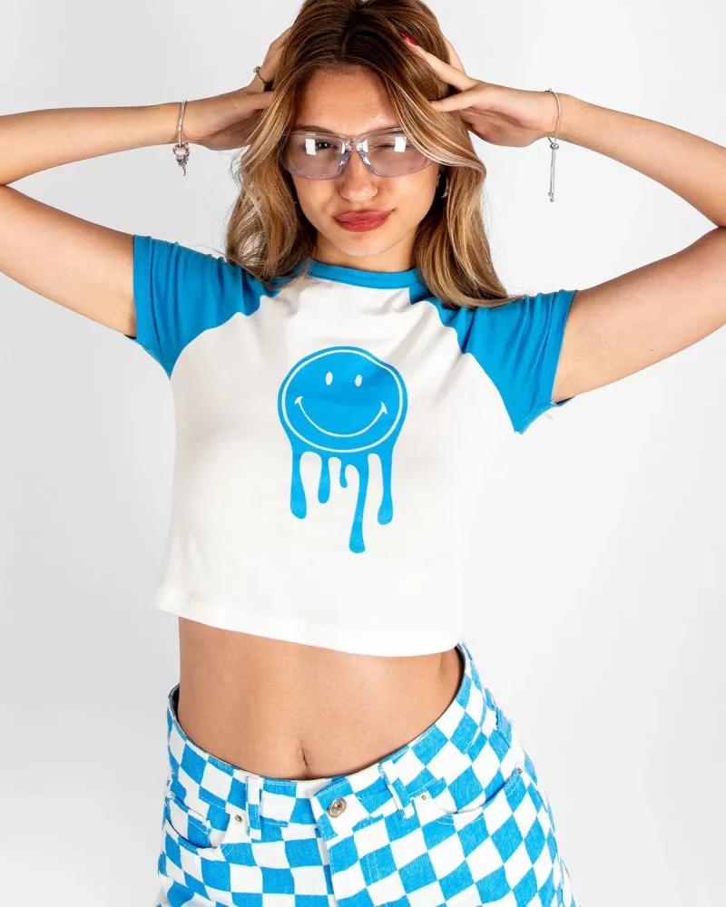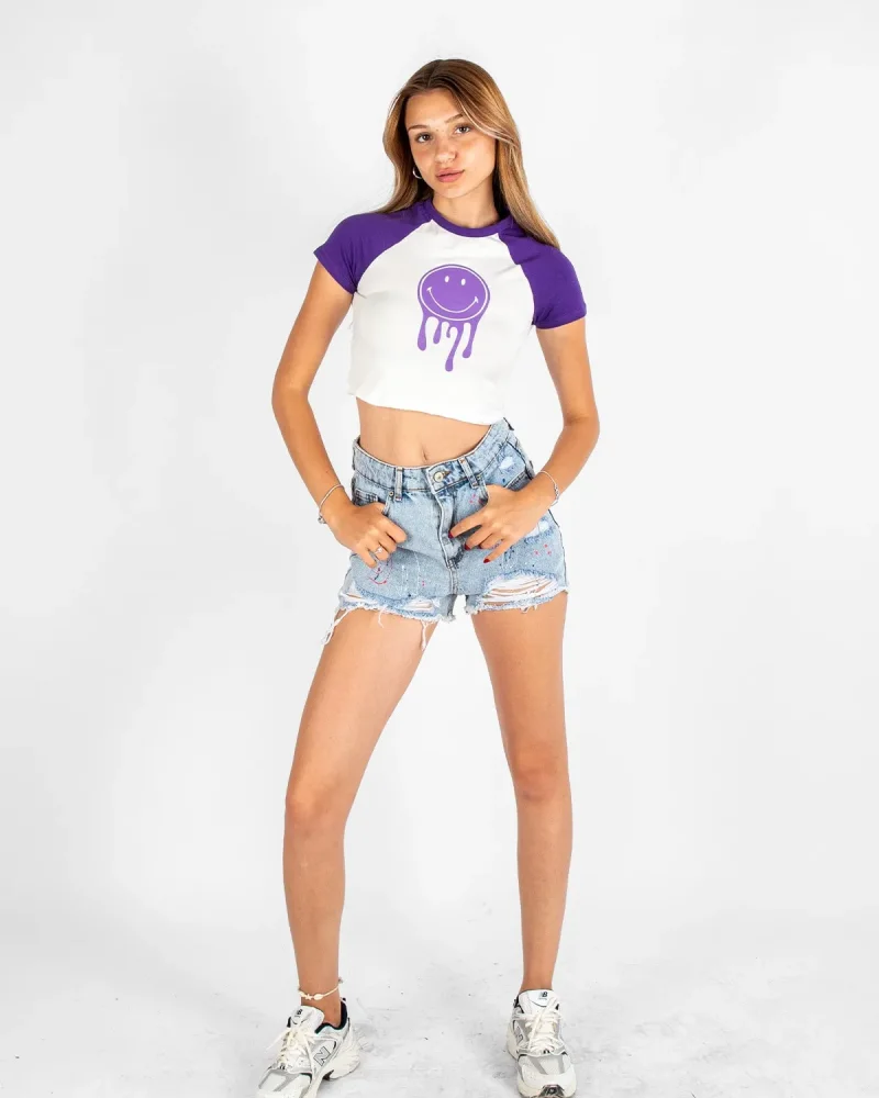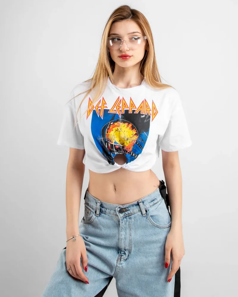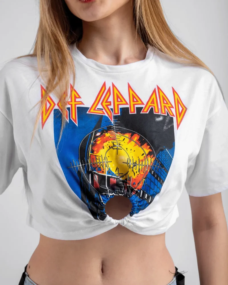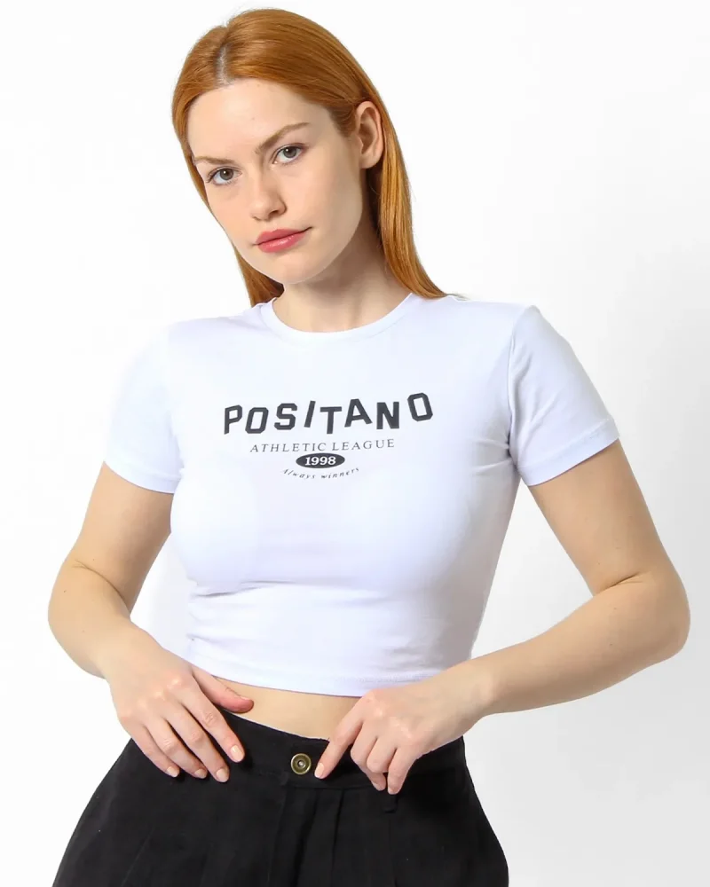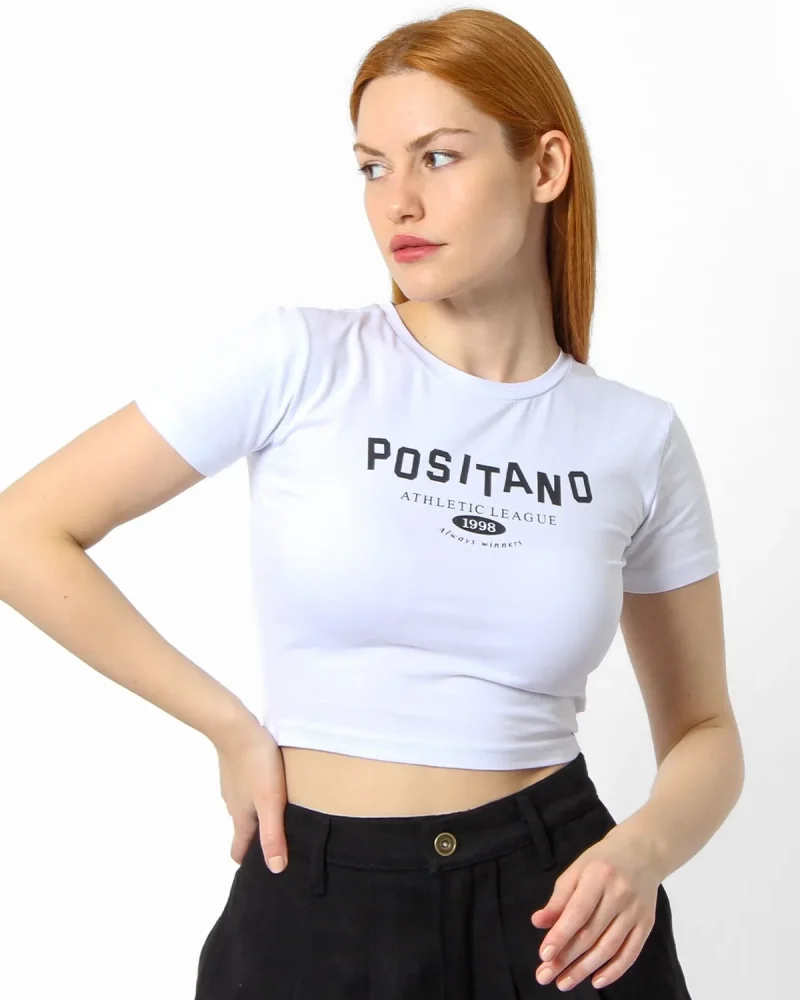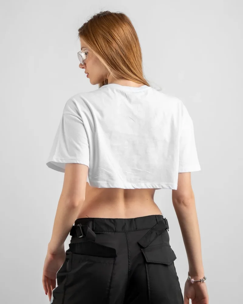 1998 Baskılı Kısa Kollu Beyaz Crop