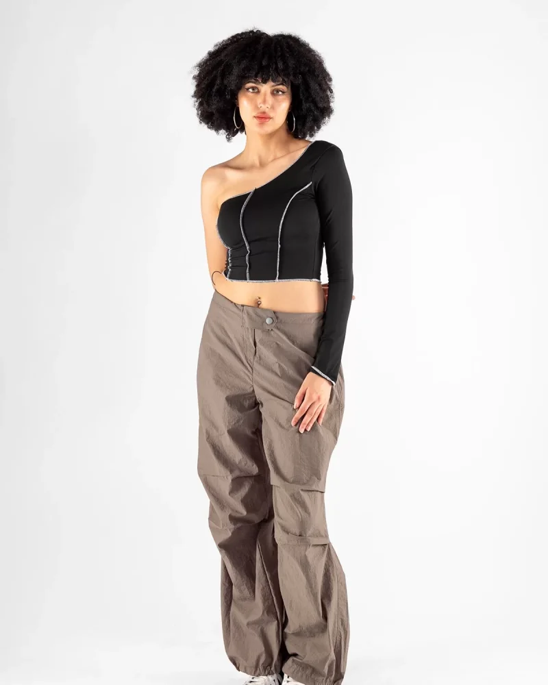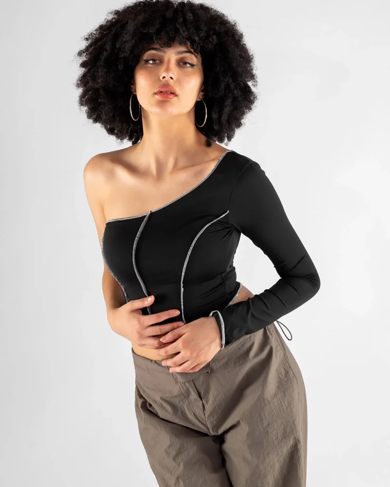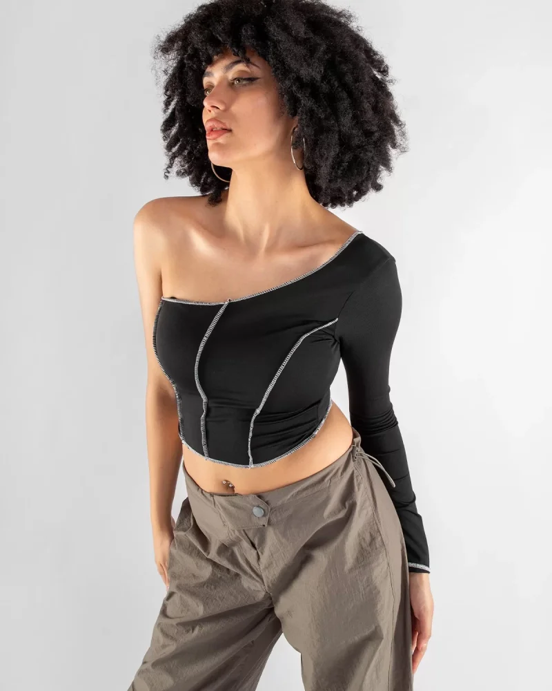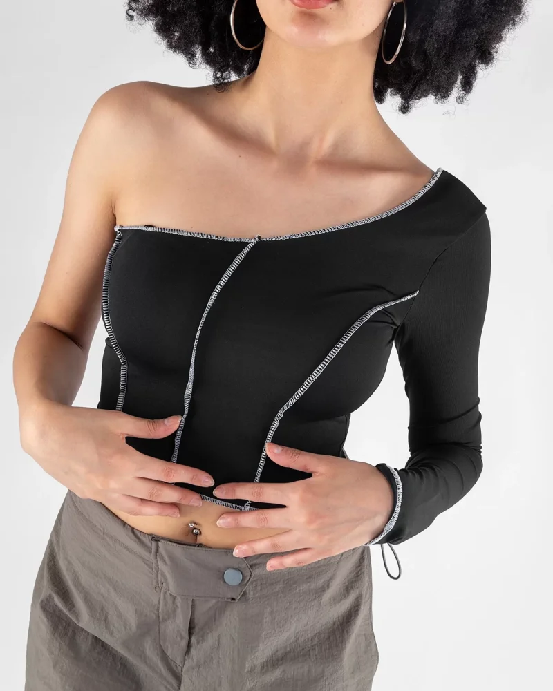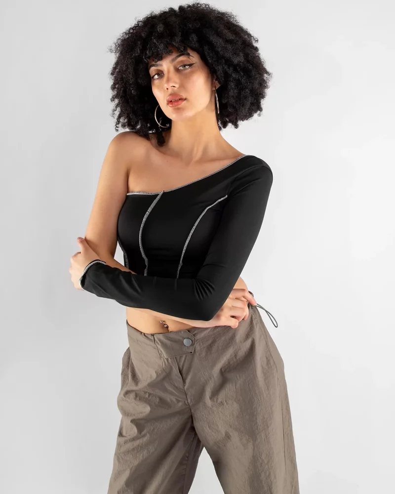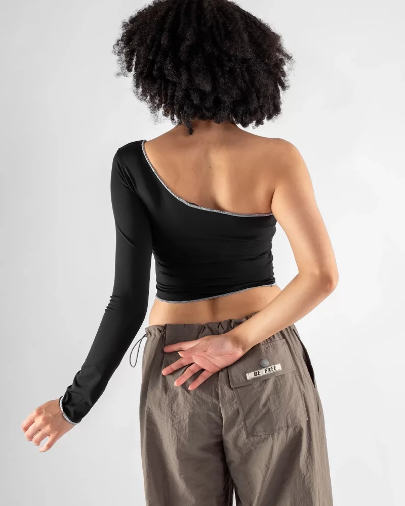 Tek Kol Detay Ters Dikiş Siyah Crop