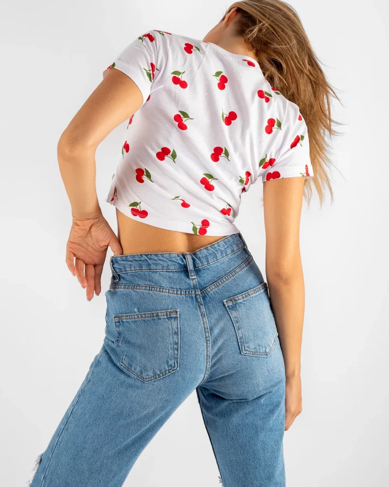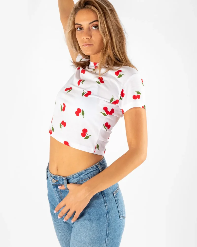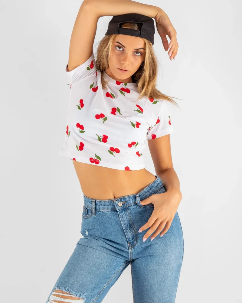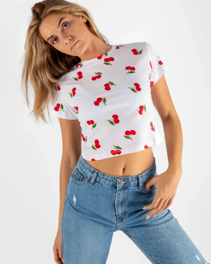 Cherry Baskılı Kısa Kol Beyaz Tshirt Crop