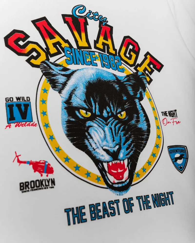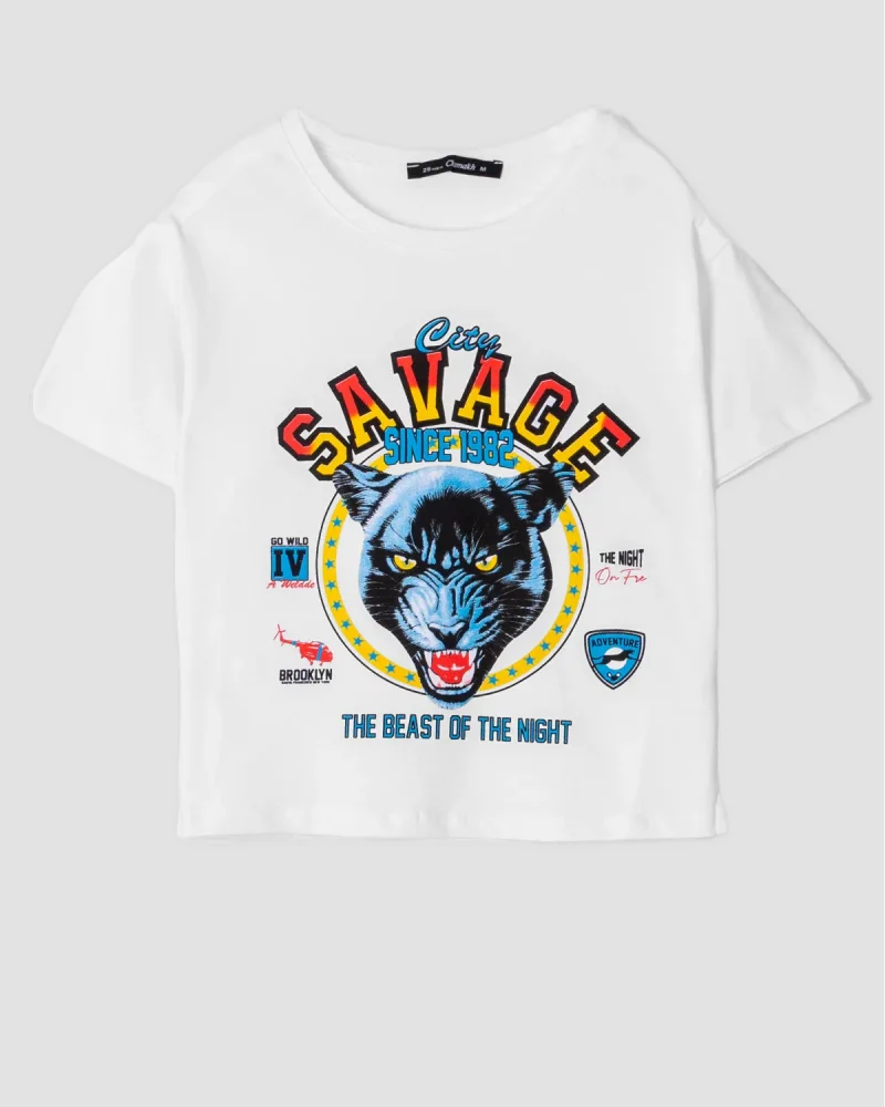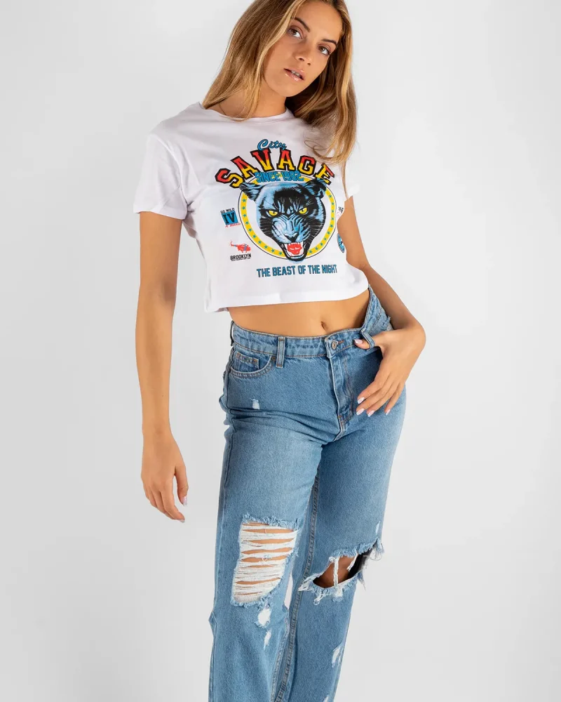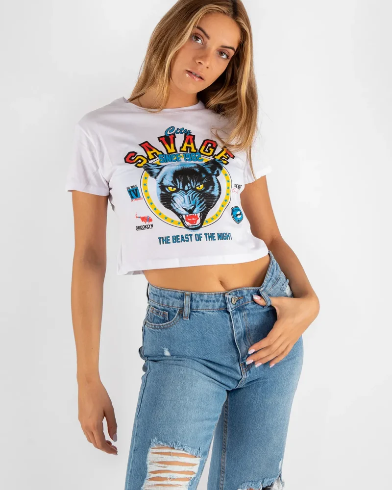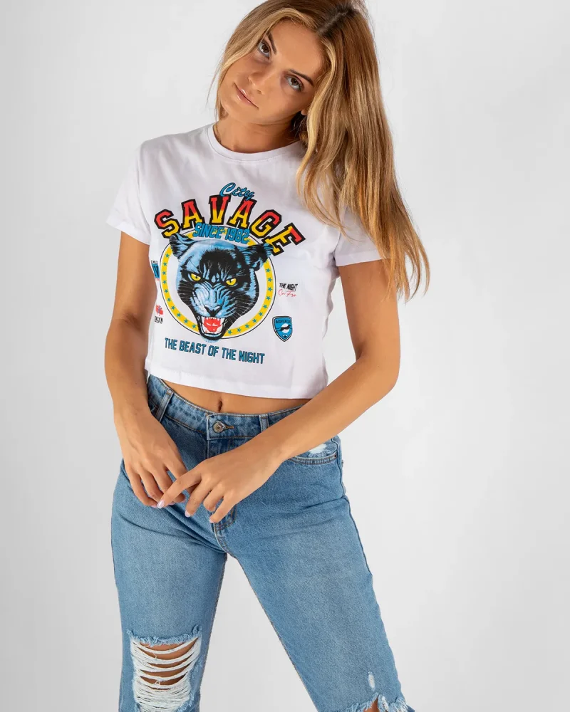 City Savage Tiger Baskılı Kadın Beyaz Crop Tshirt