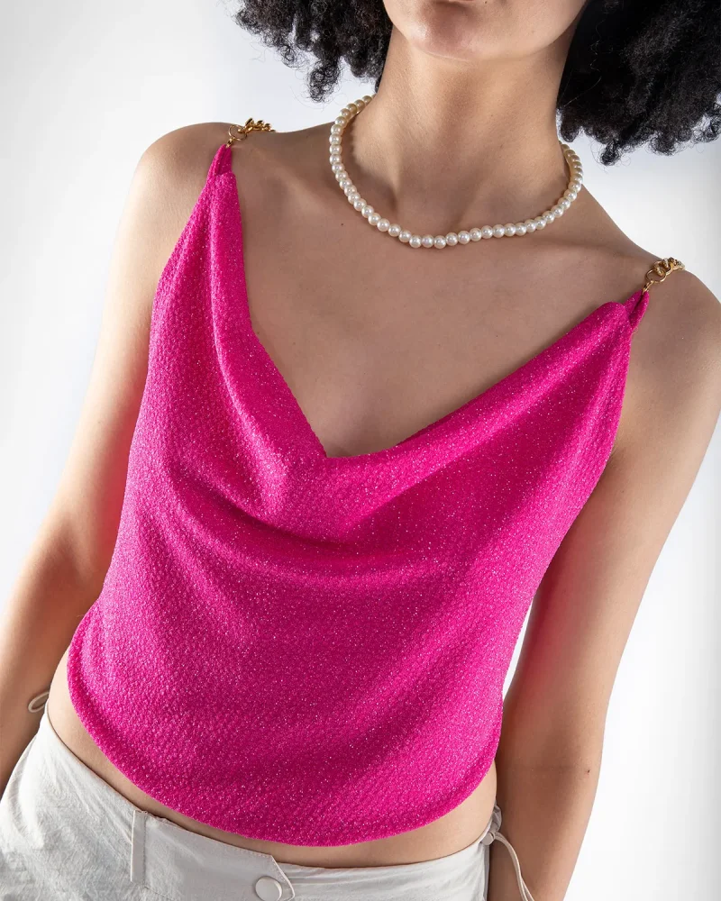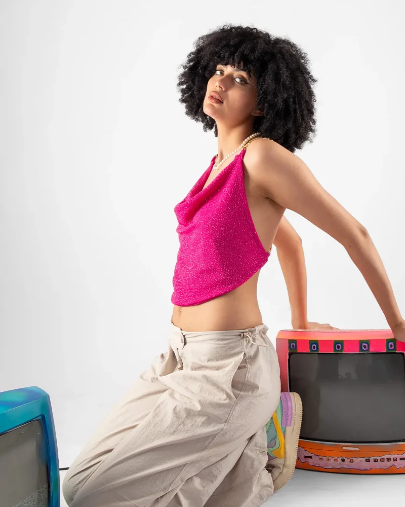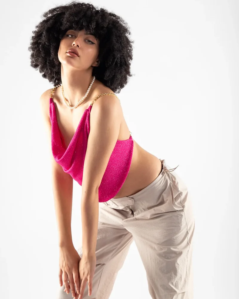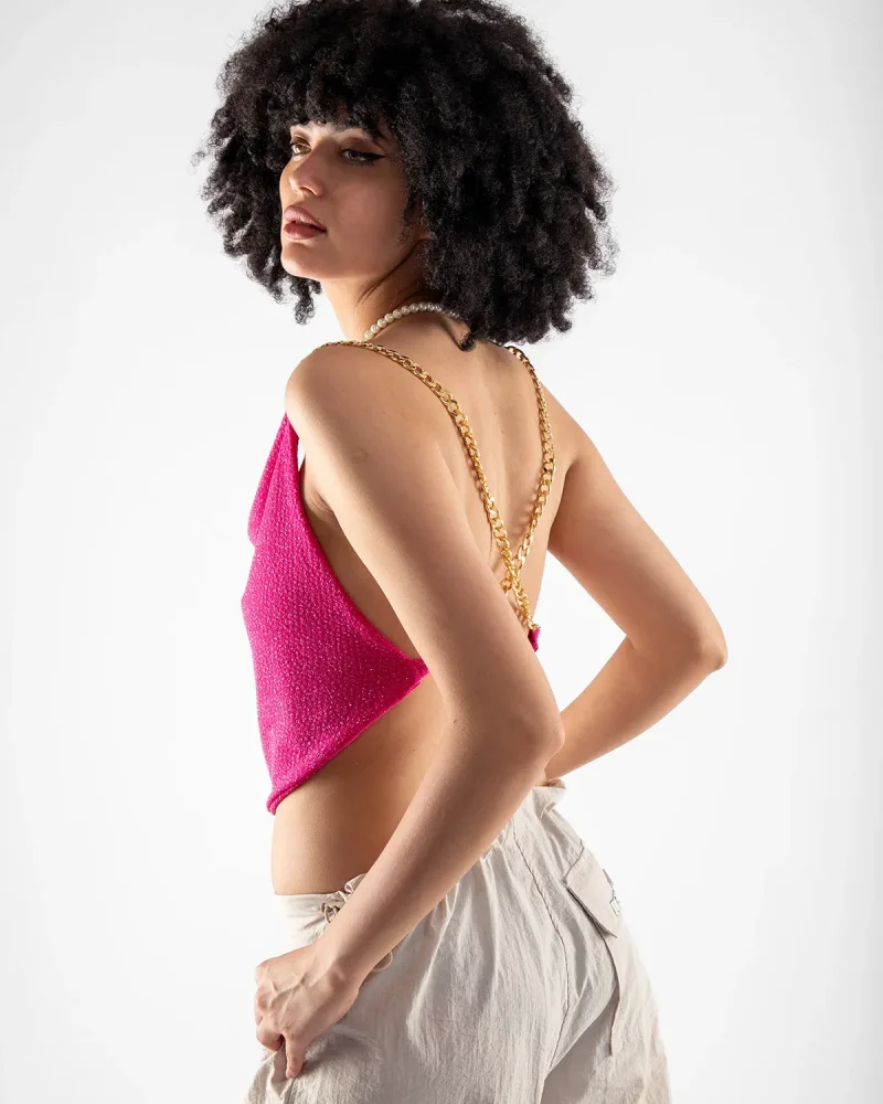 Degaje Yaka Sırt Dekolteli Fuşya Crop