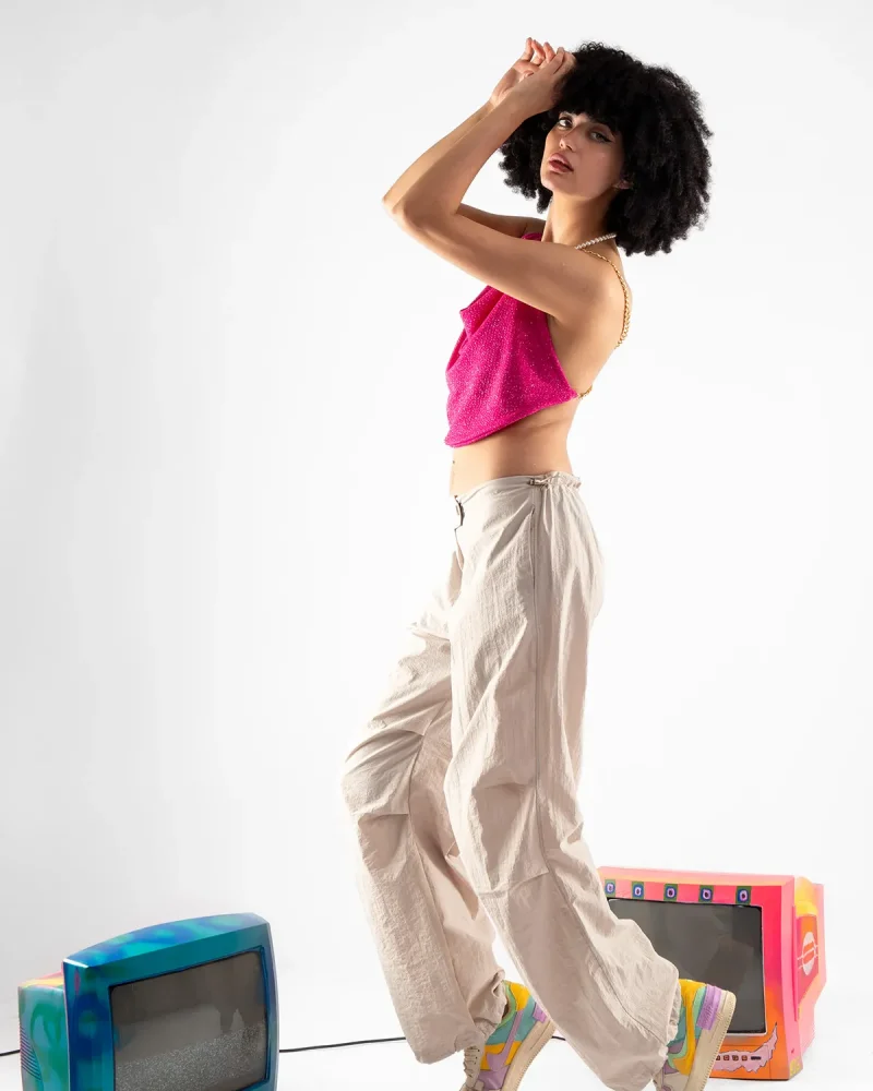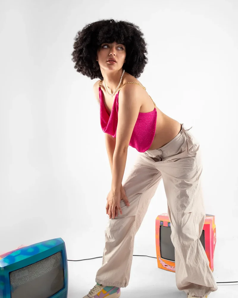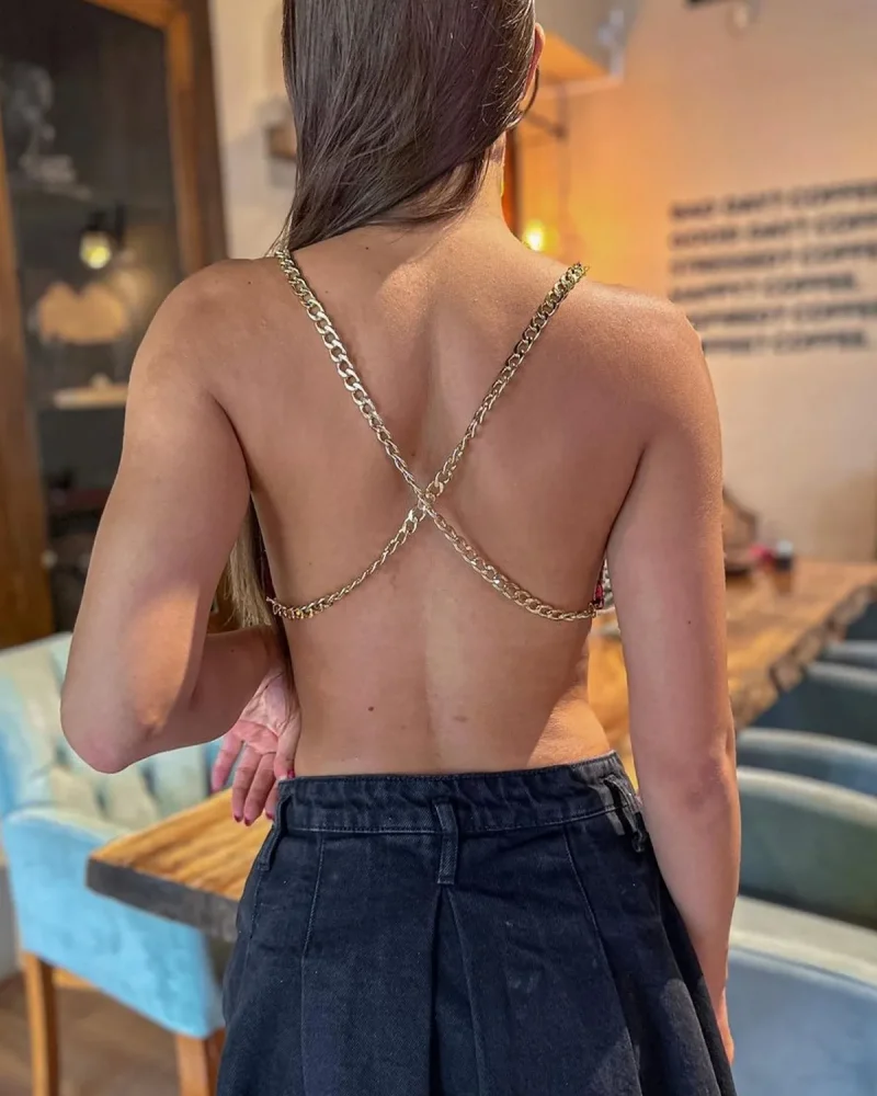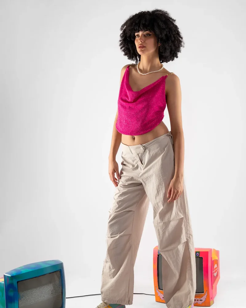 Degaje Yaka Sırt Dekolteli Fuşya Crop