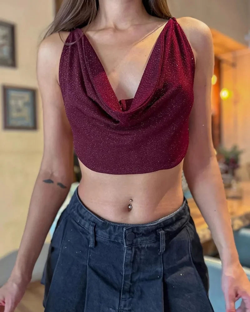 Degaje Yaka Sırt Dekolteli Bordo Crop