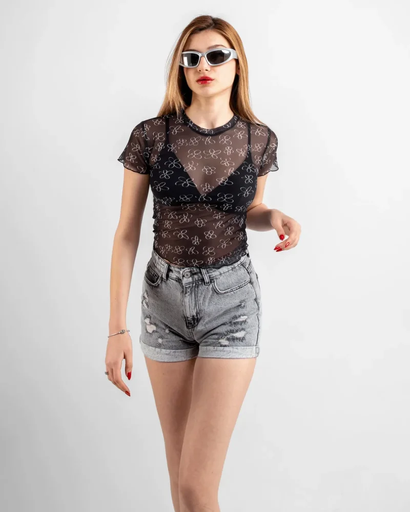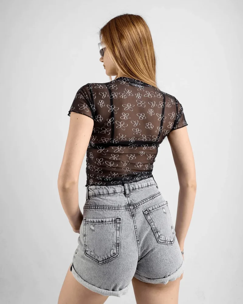 Kısa Kollu Papatya Desenli Siyah Tül Body Crop