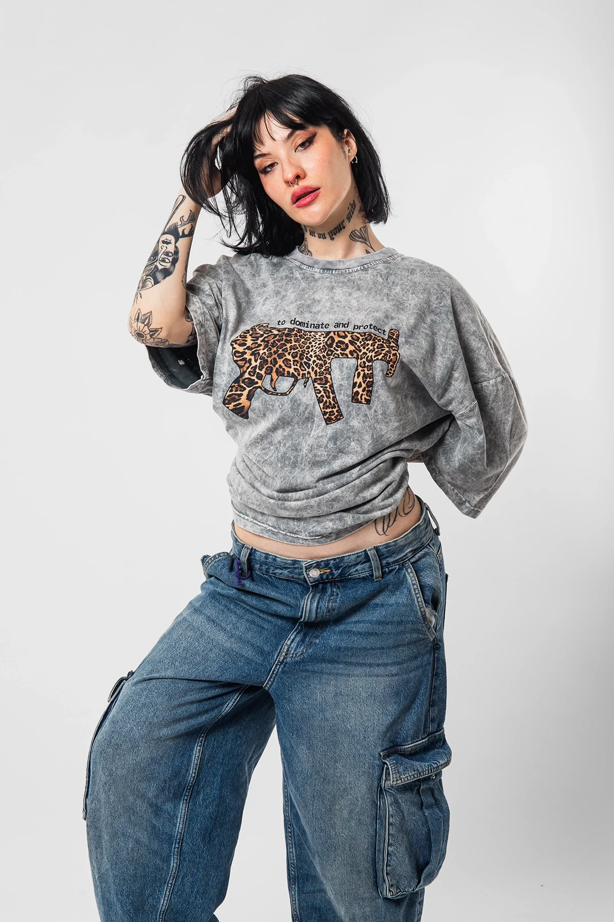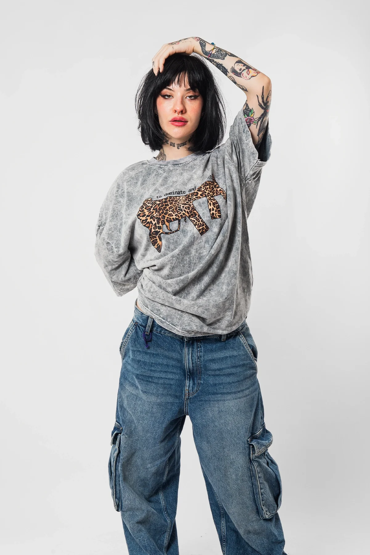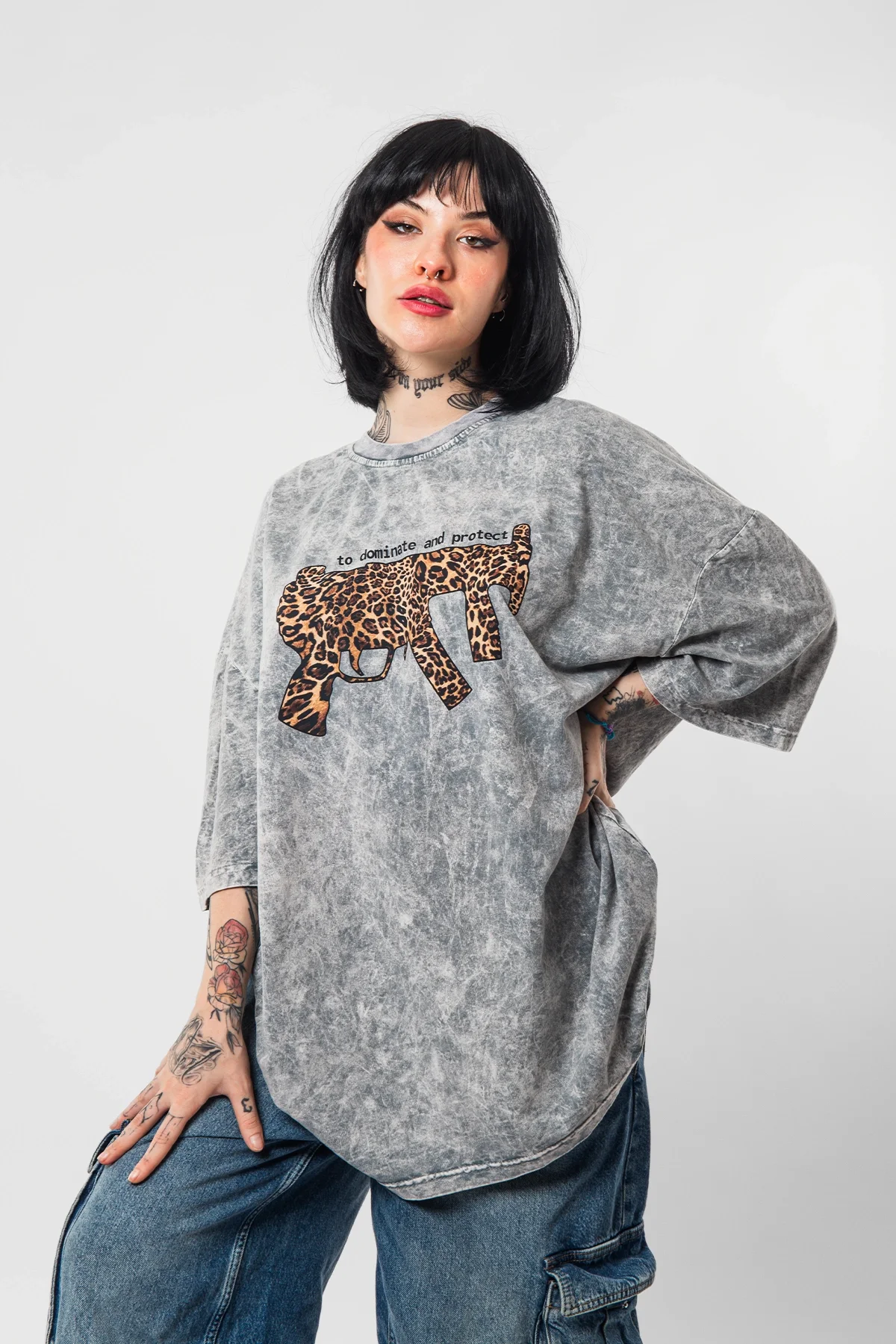 DOMİNANTE LEOPAR BASKILI OVERSİZE UNİSEX YIKAMALI BEYAZ TSHİRT