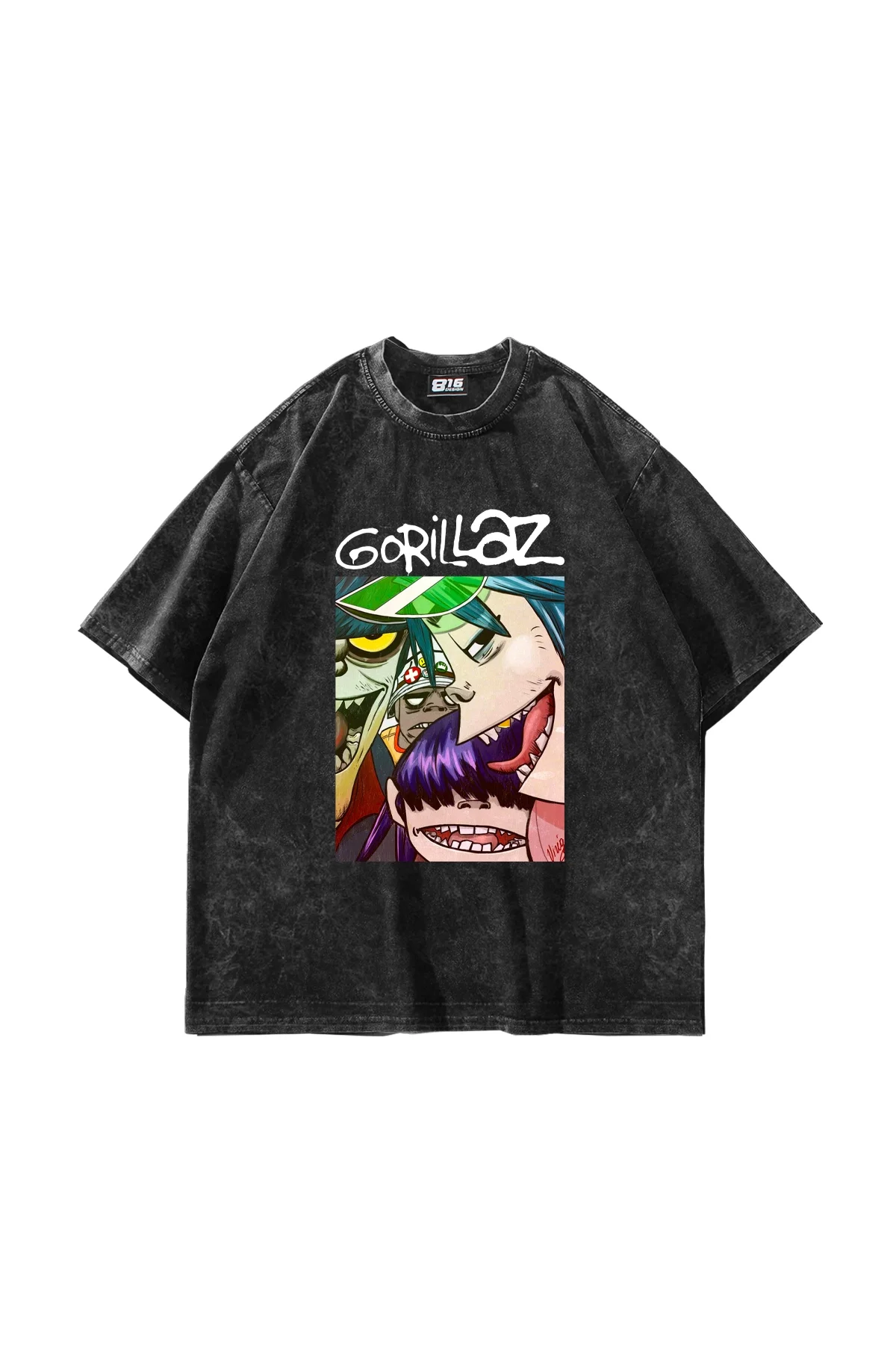 Gorillaz baskılı oversize unisex yıkanmış siyah tshirt ile sokak modasına uyum sağlayın, Bak Moda kalitesiyle şıklığı keşfedin!