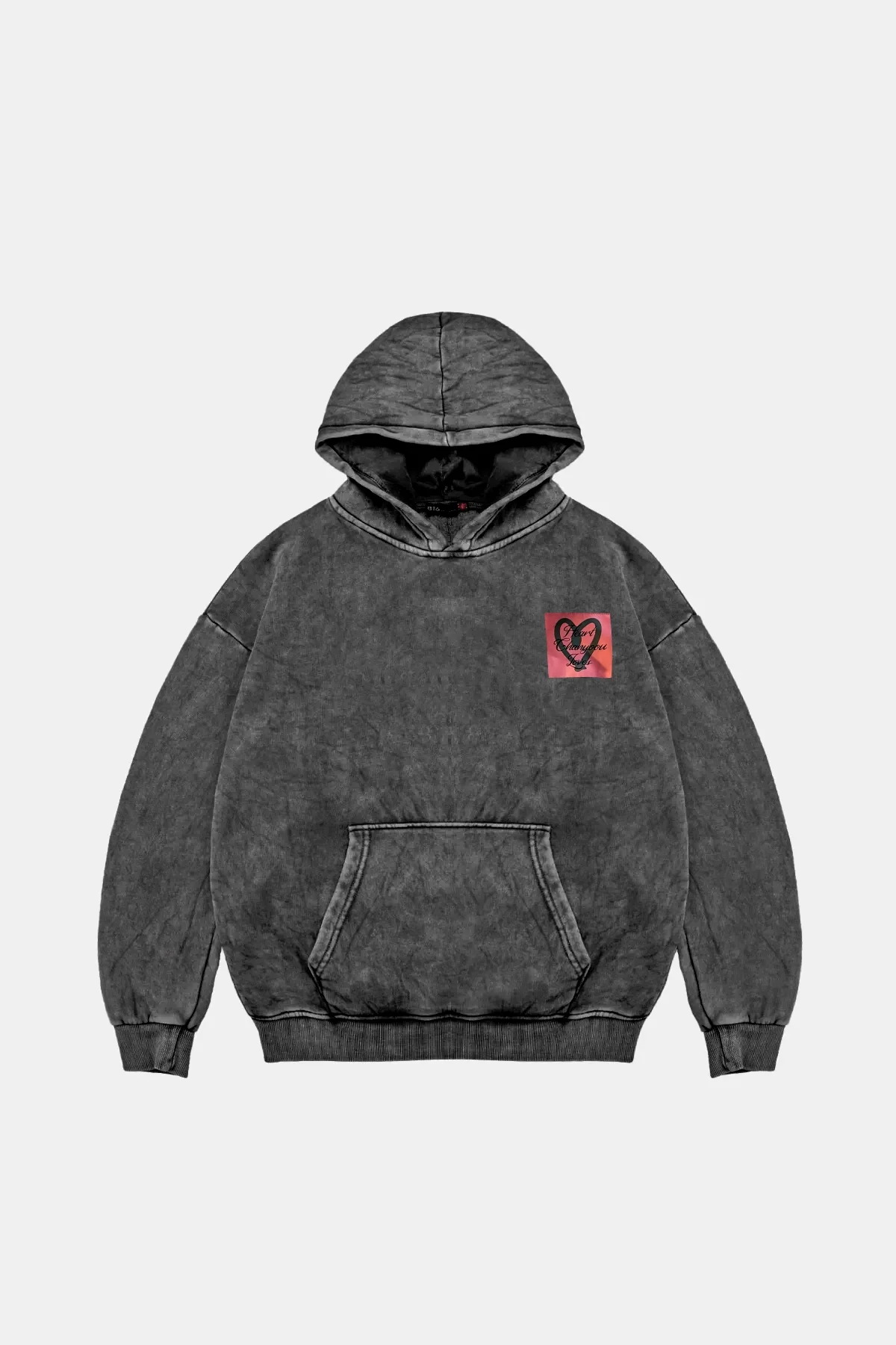 LOVE BASKILI OVERSİZE UNİSEX YIKAMALI SİYAH HOODİE