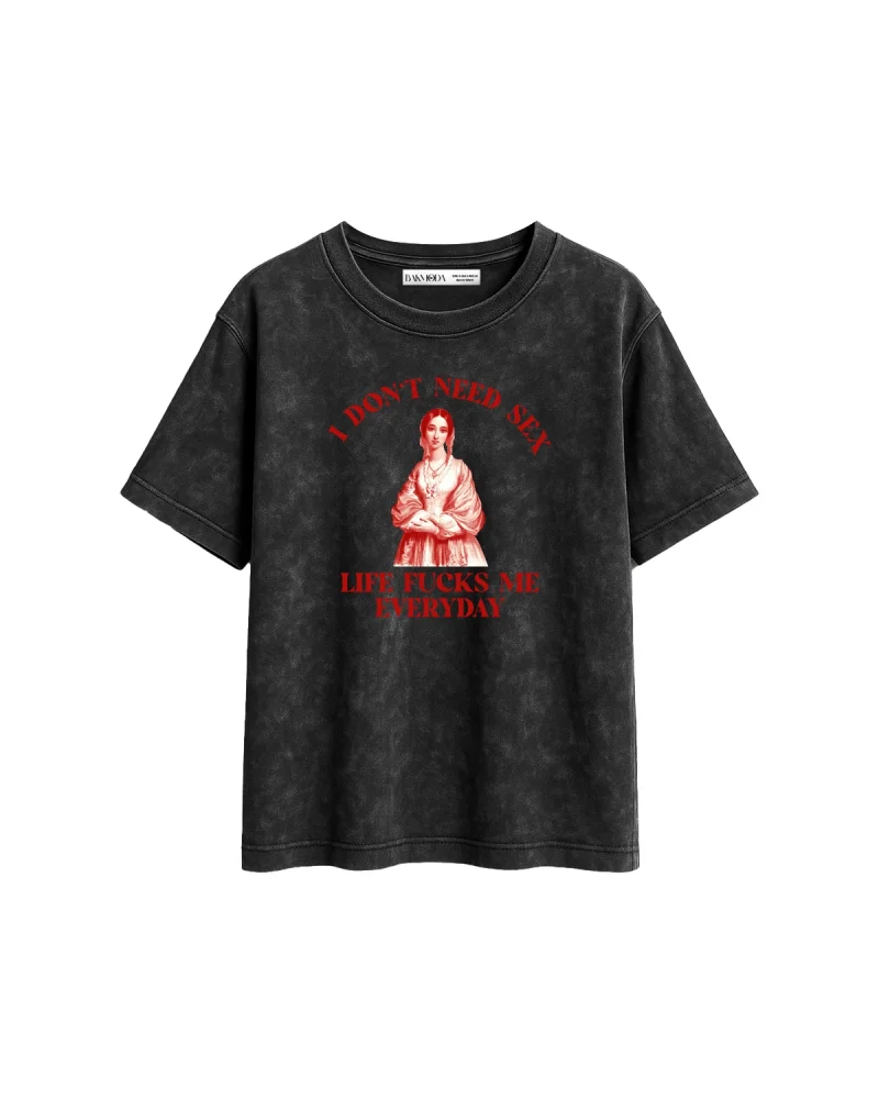 I Don't Need Baskılı Relaxed Fit Yıkamalı Siyah Kadın Tshirt