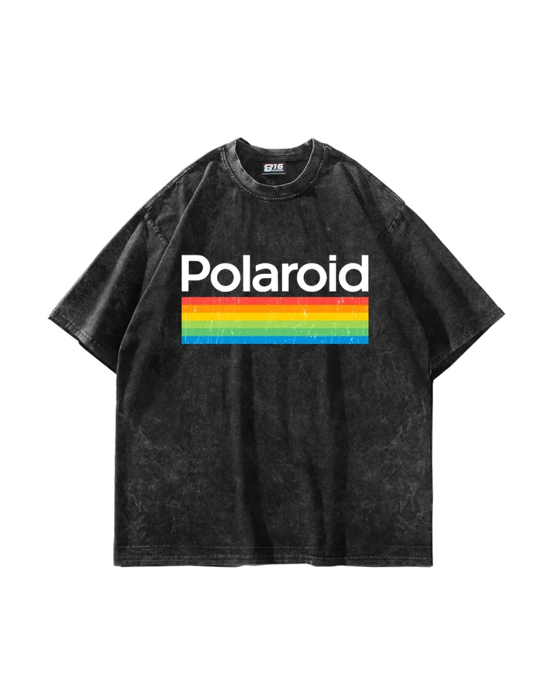 Polaroid Baskılı Oversize Unisex Yıkamalı Siyah Tshirt