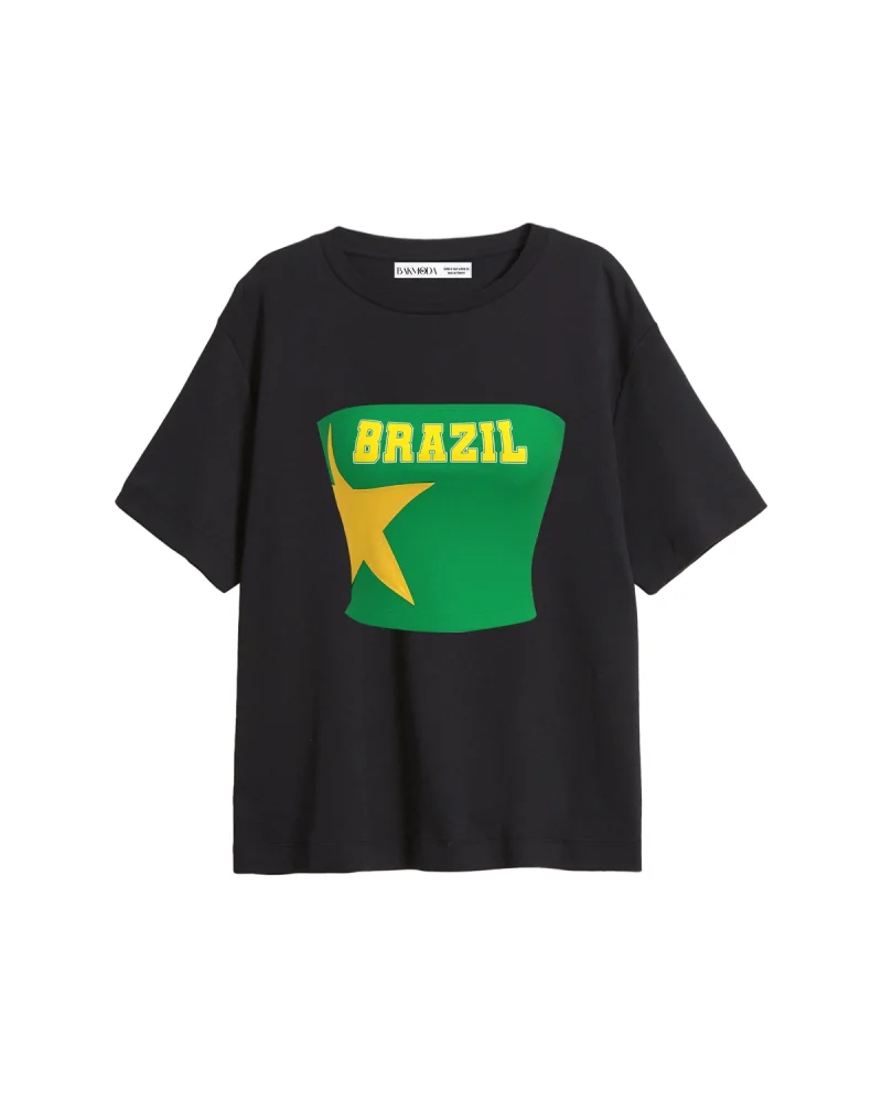 Brasil Star Baskılı Relaxed Fit Siyah Kadın Tshirt