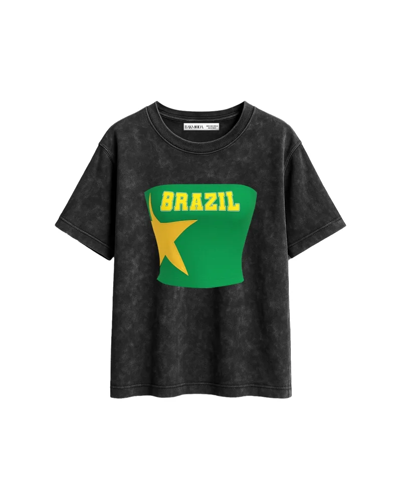 Brasil Star Baskılı Relaxed Fit Yıkamalı Siyah Kadın Tshirt