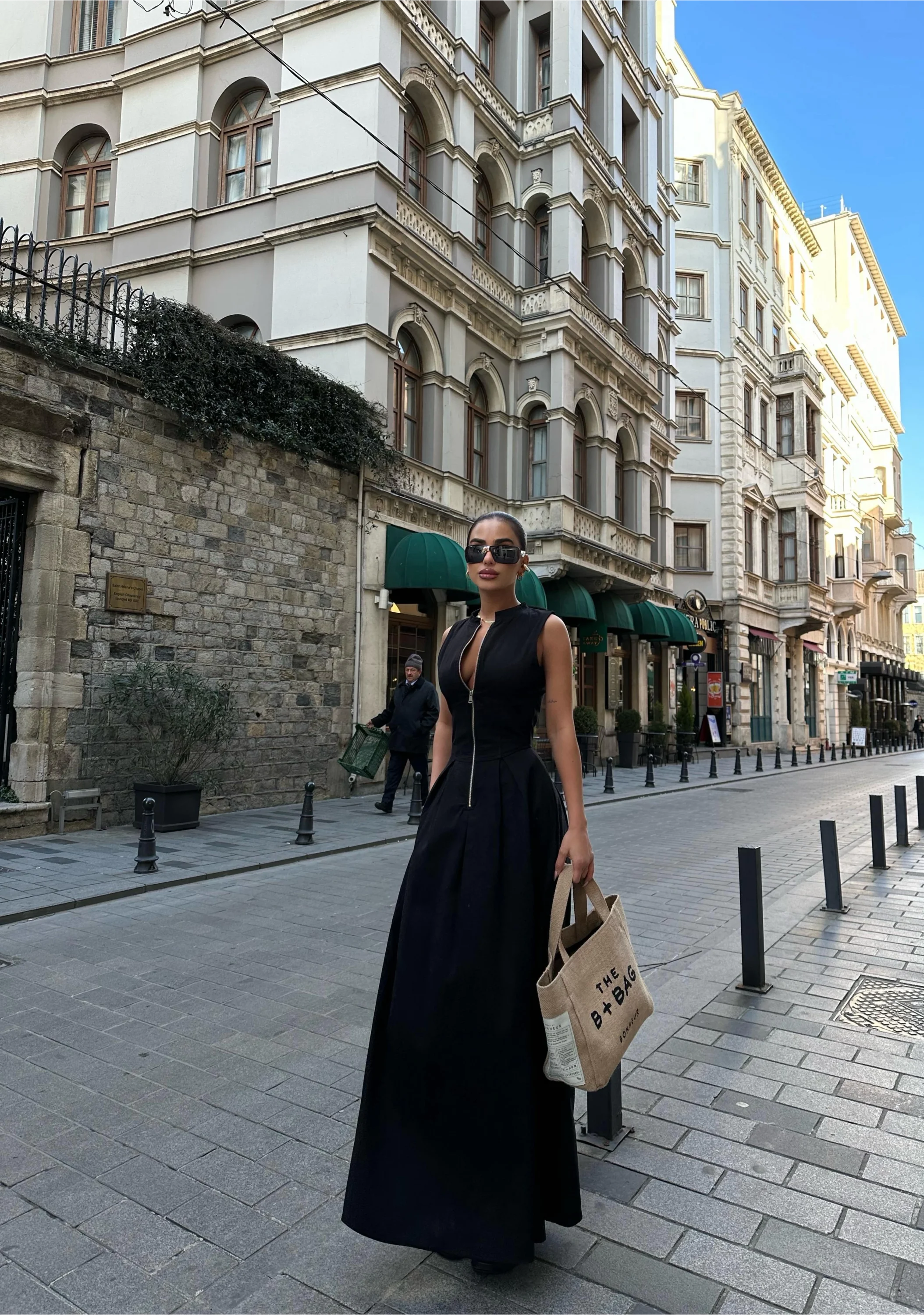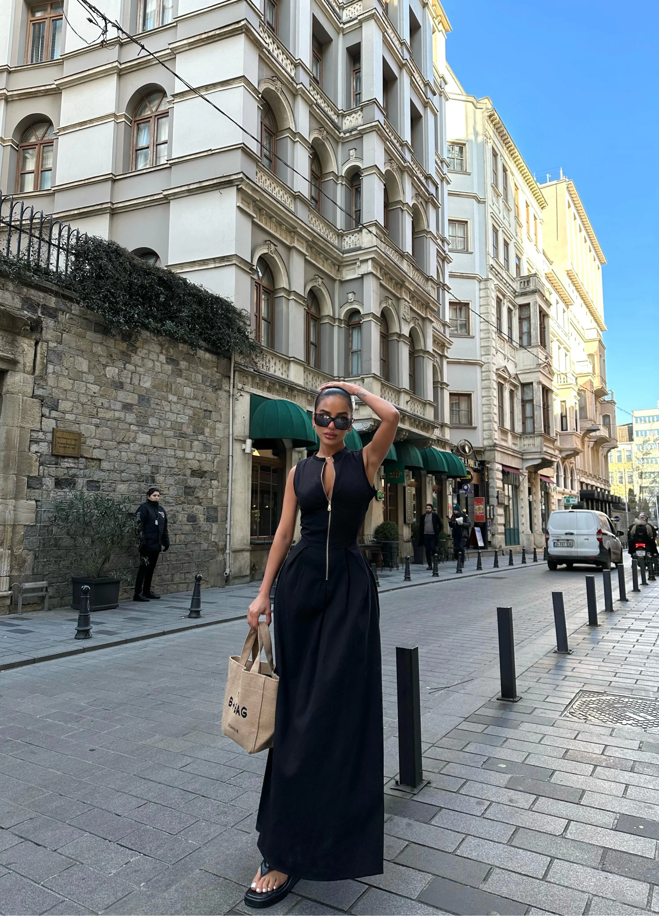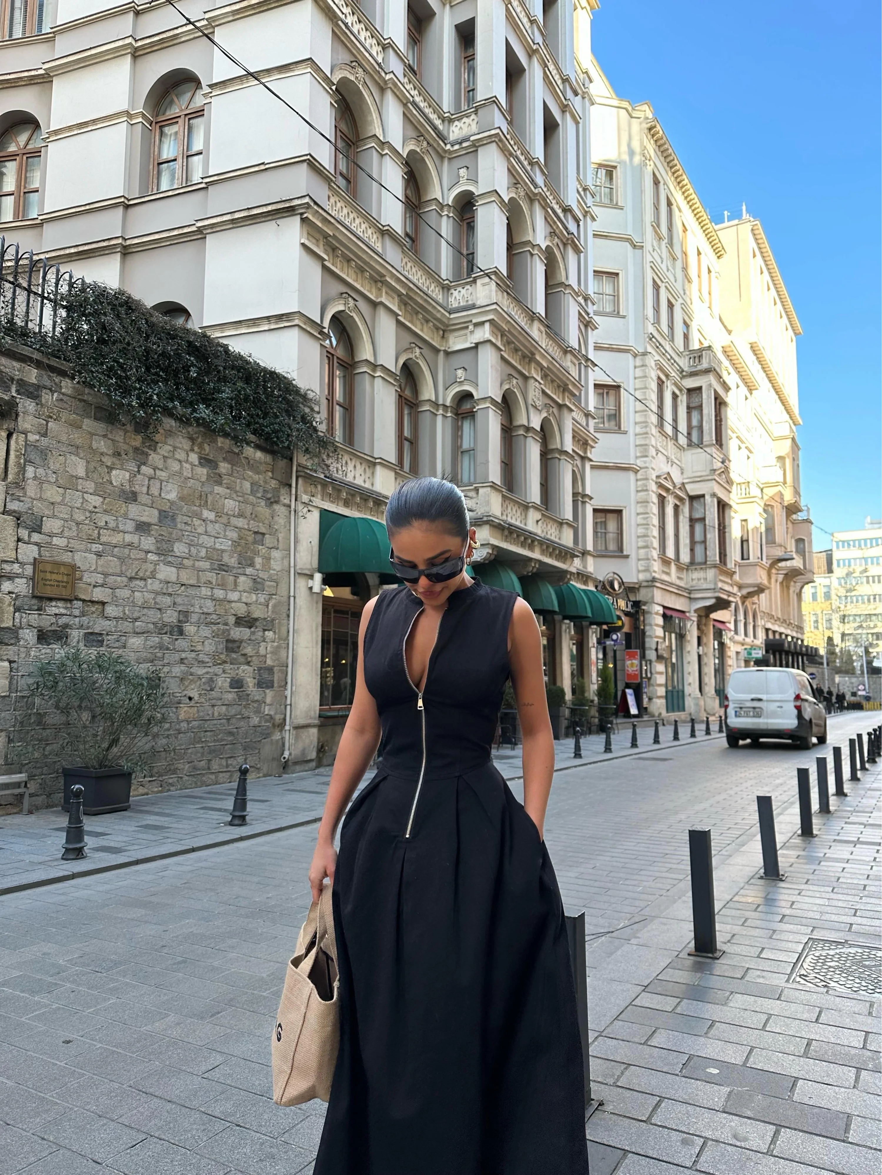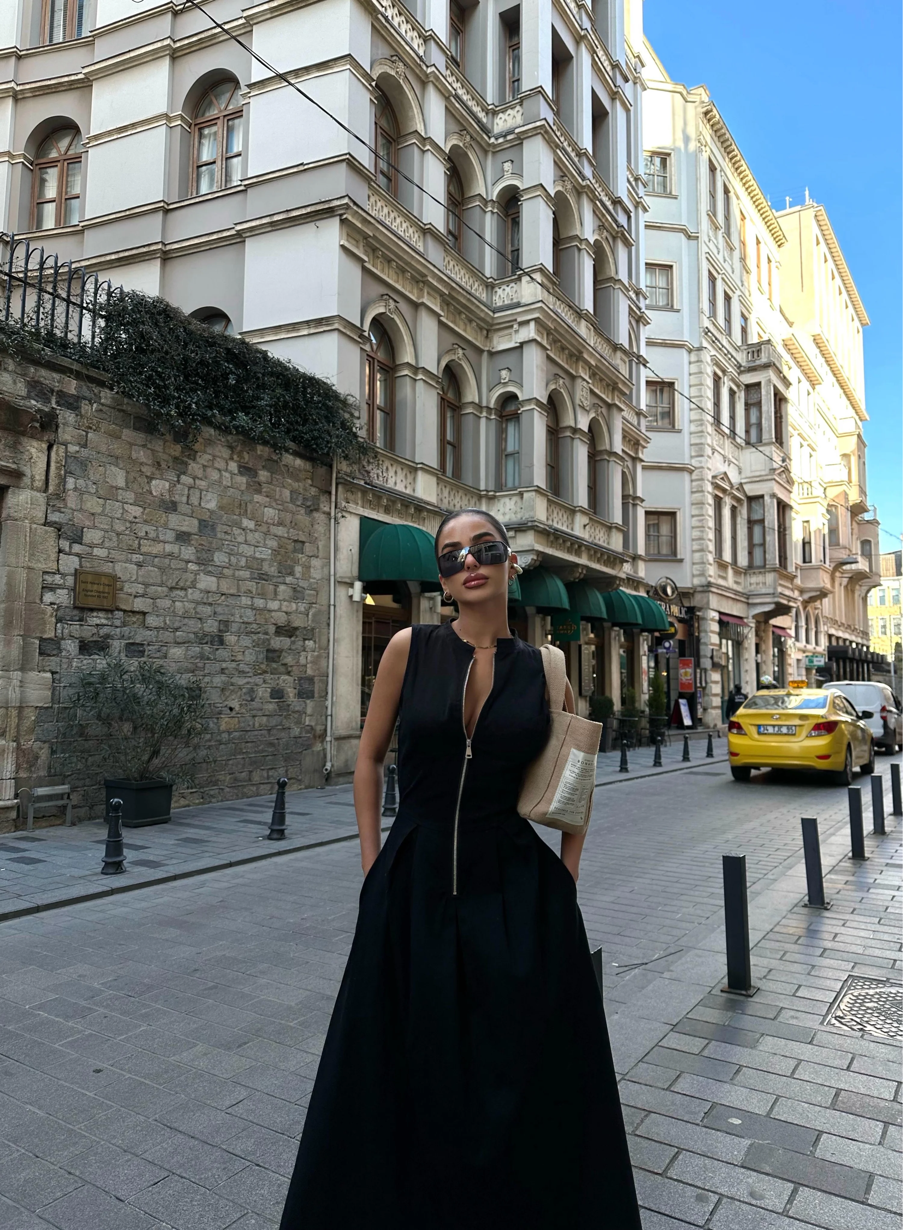 Ön Fermuar Detaylı Bele Oturan Siyah Elbise, şıklığı ve zarafeti bir arada sunan Bak Moda'nın öne çıkan tasarımlarından biridir.