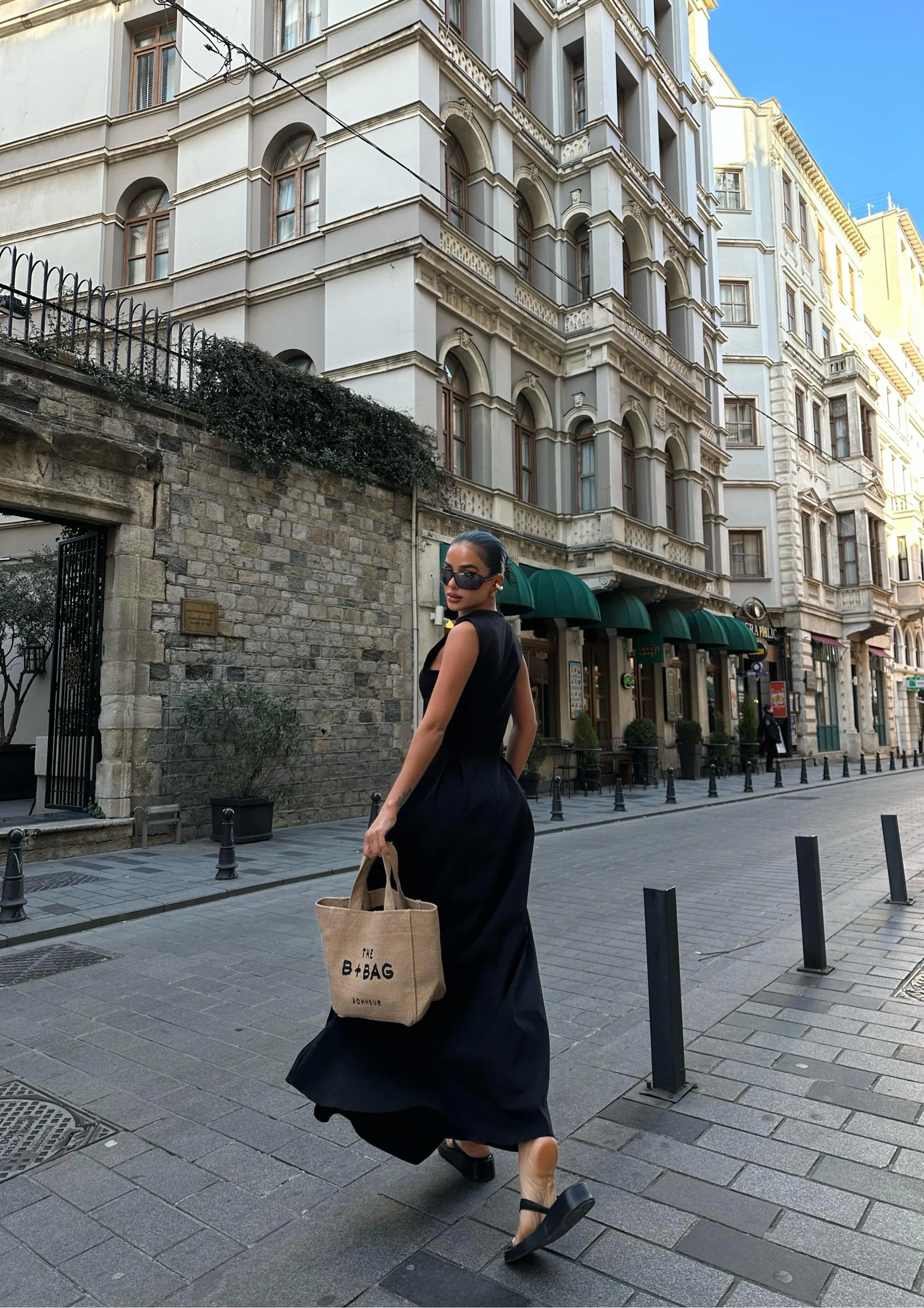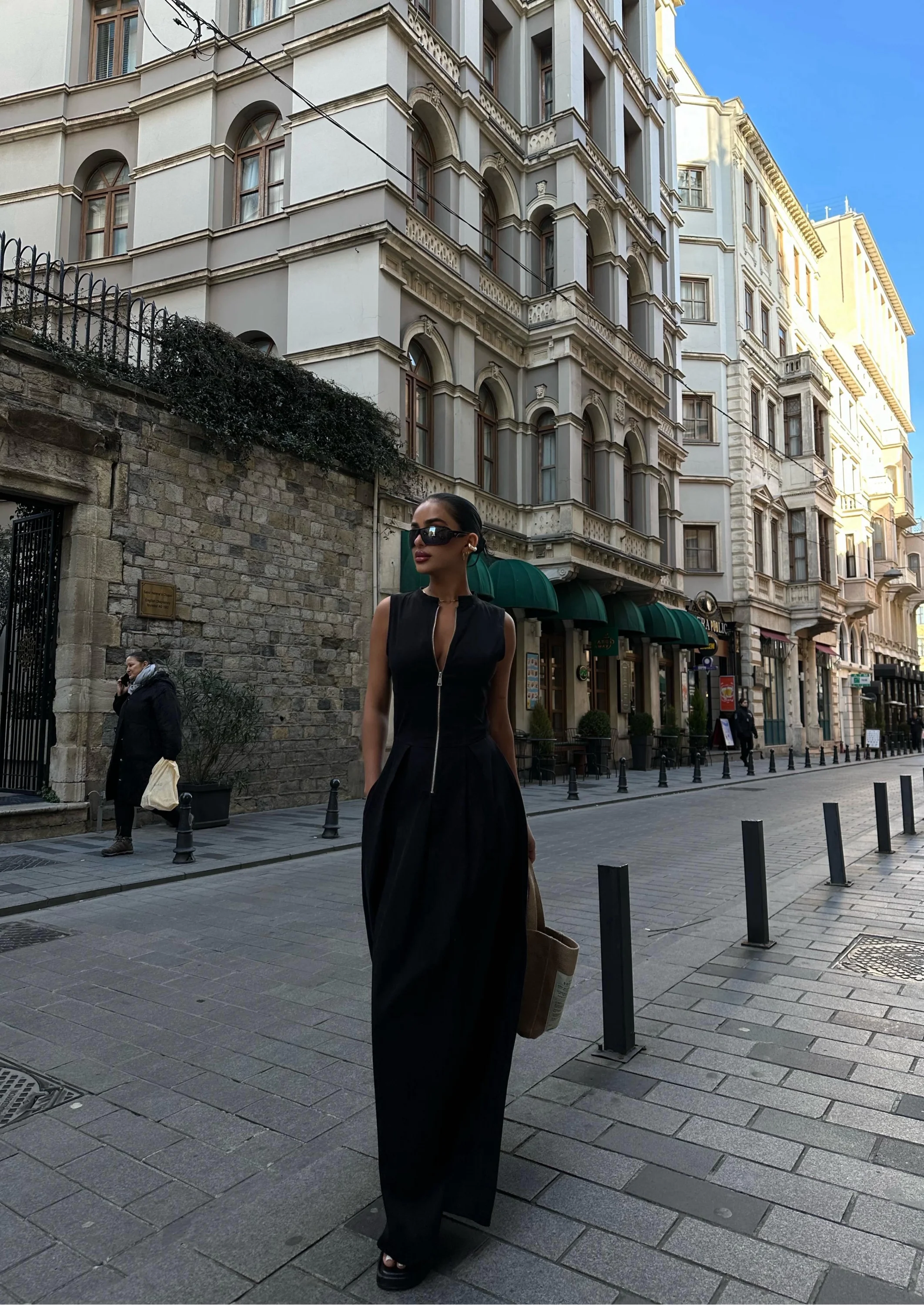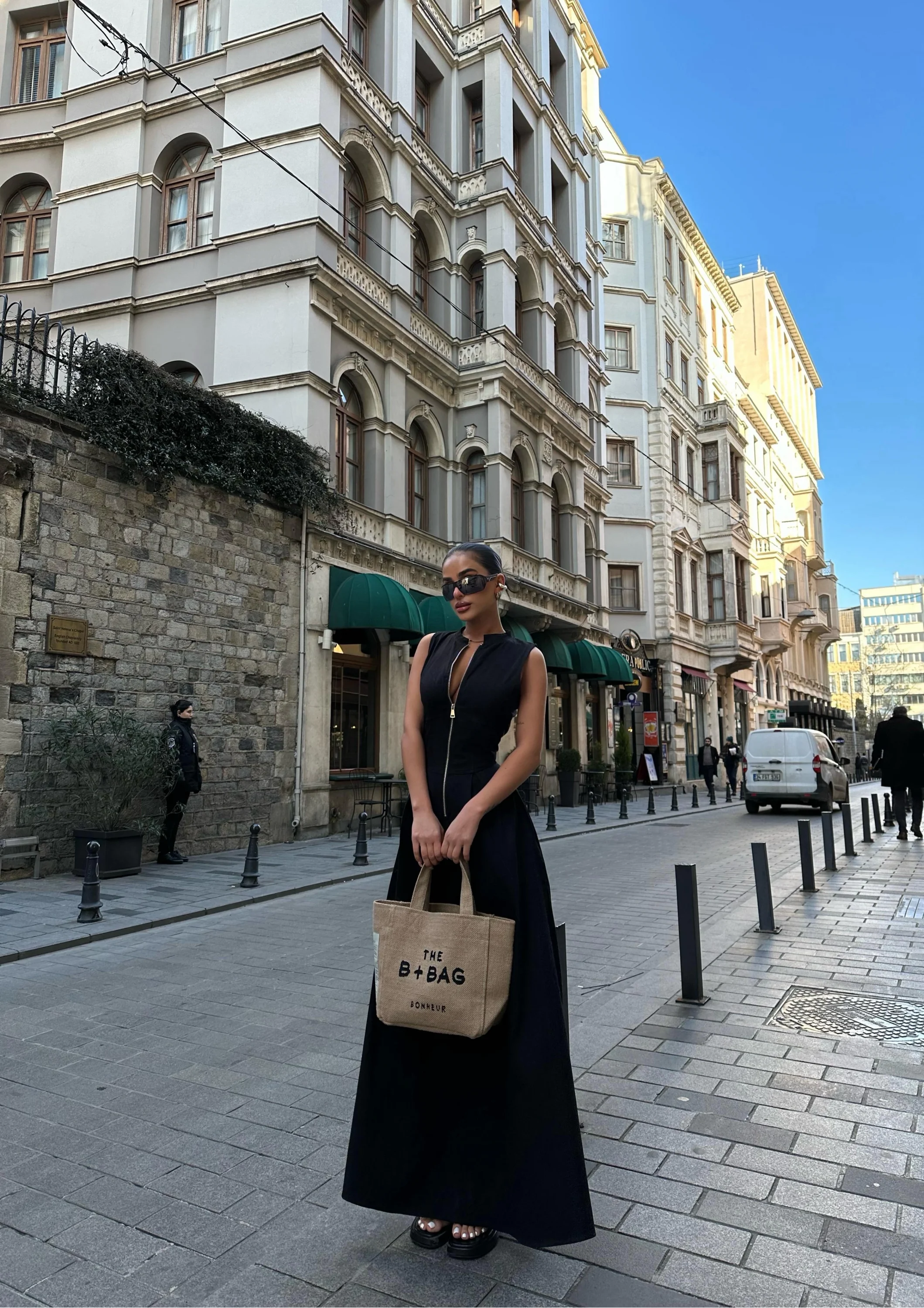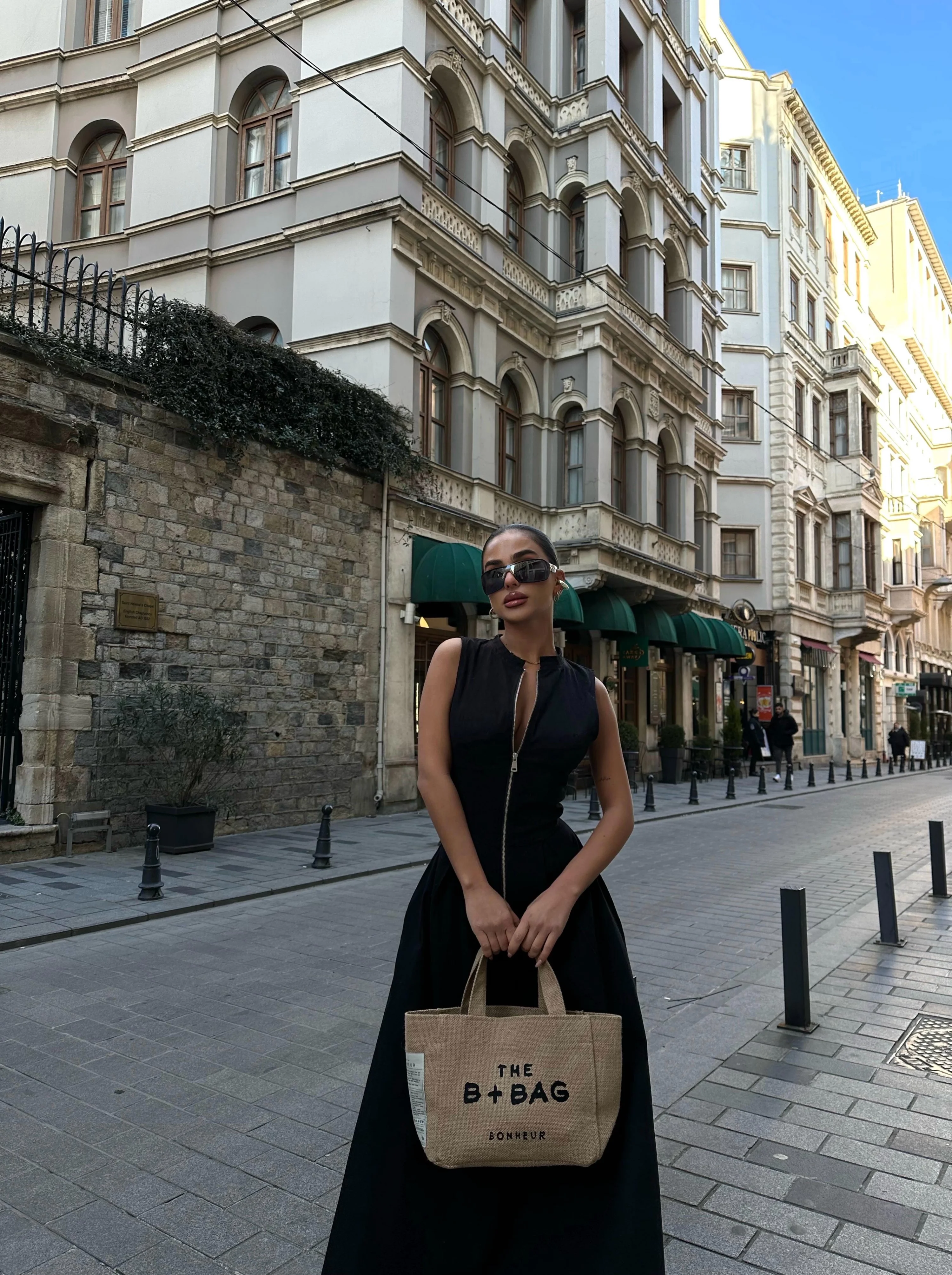 Ön Fermuar Detaylı Bele Oturan Siyah Elbise, şıklığı ve zarafeti bir arada sunan Bak Moda'nın öne çıkan tasarımlarından biridir.