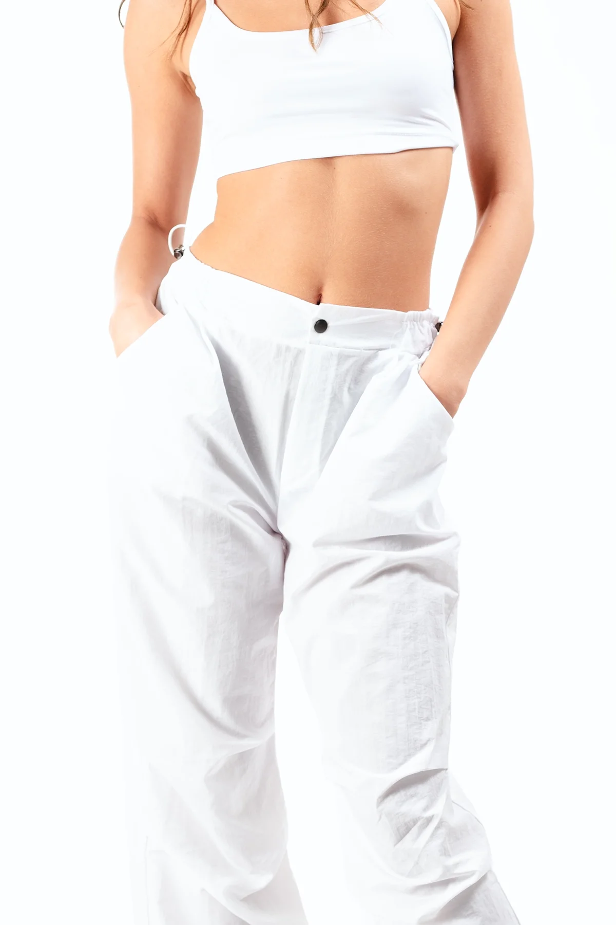 Sokak modasının vazgeçilmez parçası kargo pantolonlar, şimdi paraşüt kumaşın hafifliğiyle yeniden yorumlanıyor! Beyaz renkli, cep detaylı bu kadın kargo pantolon, hem konforlu yapısıyla hem de modern kesimiyle stilinize dinamik bir dokunuş katıyor.