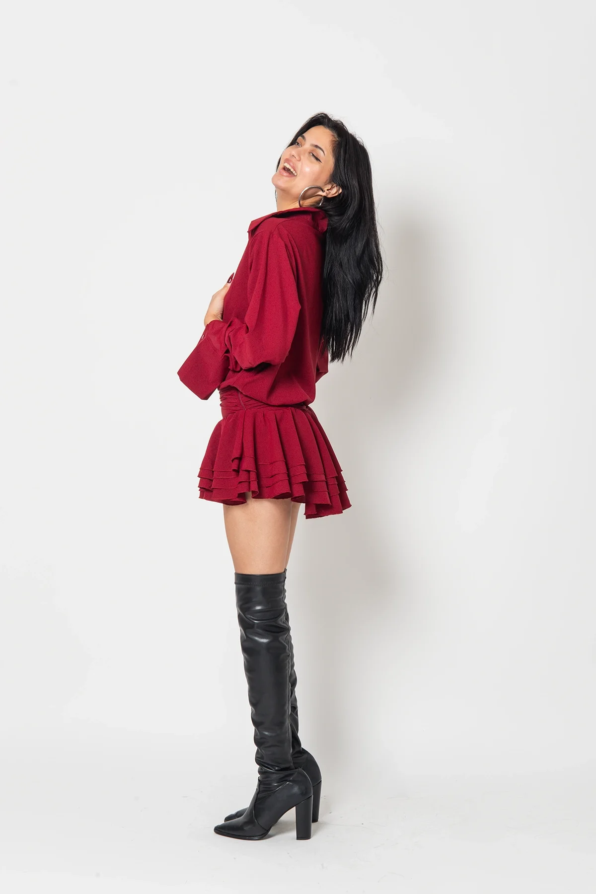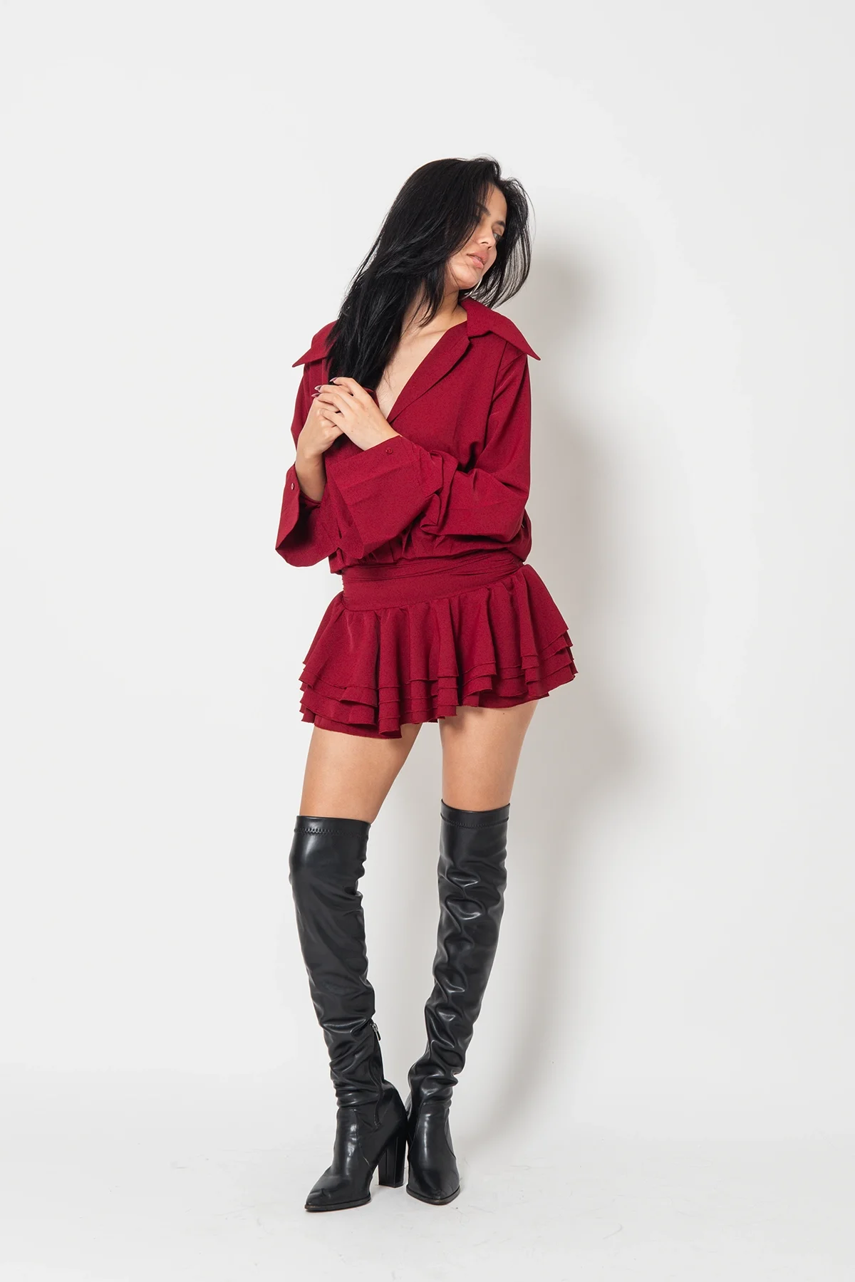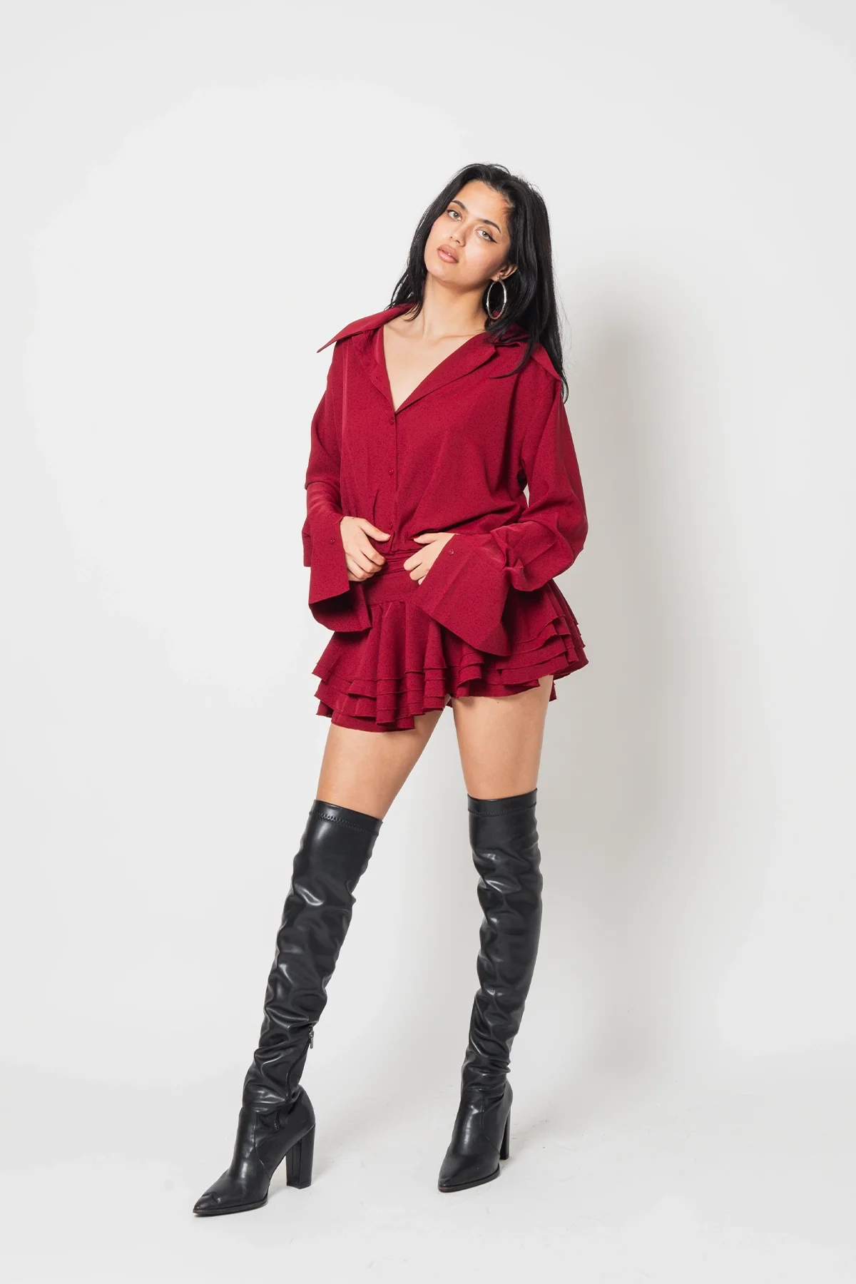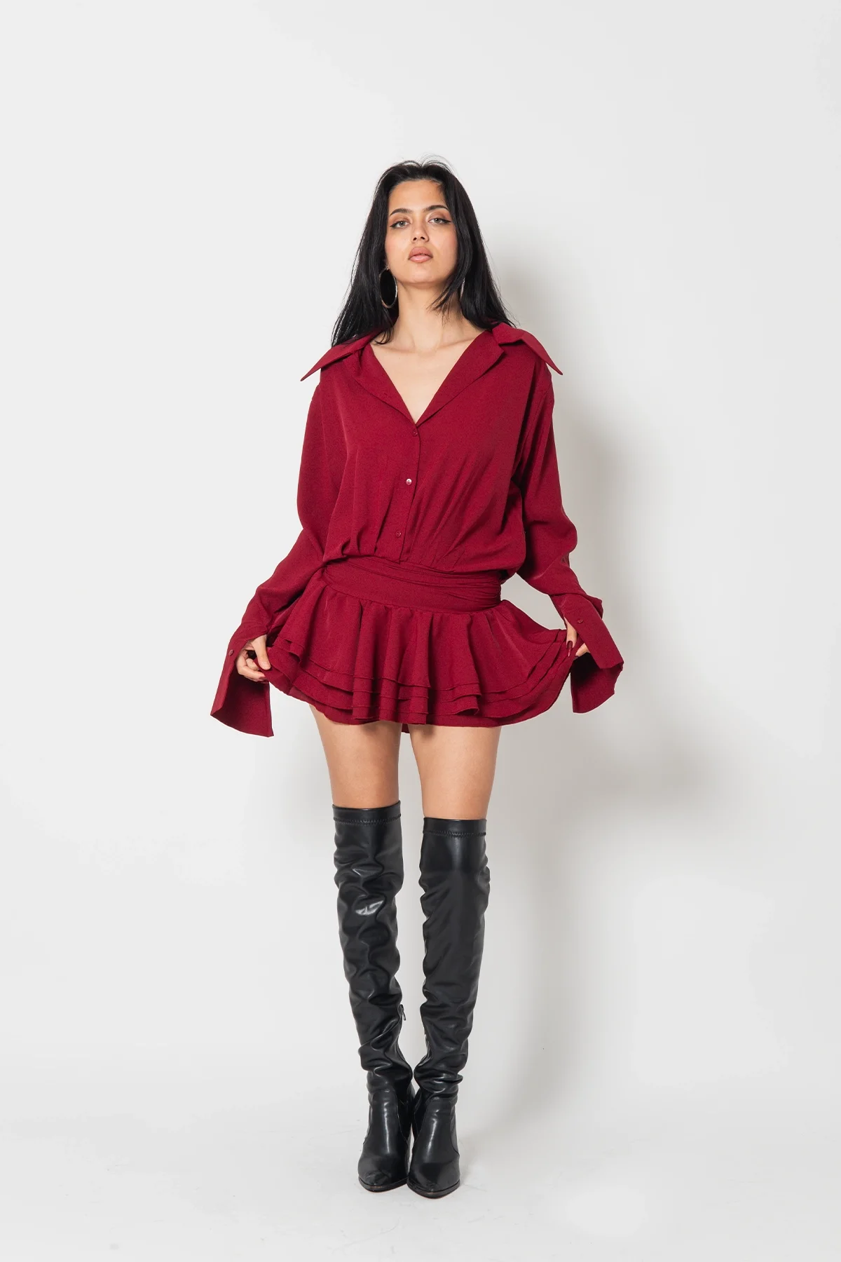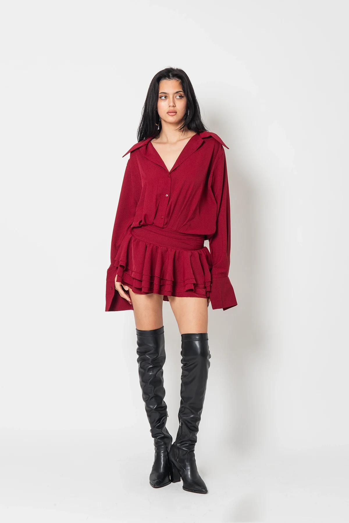 Modern ve zarif tasarımıyla dikkat çeken Pileli Bordo Kemer Detaylı Jessica Kumaş Gömlek Elbise, hem şık hem de rahat bir görünüm sunar. Yumuşak dokulu Jessica kumaşı sayesinde gün boyu konfor sağlarken, pile detayları hareketli ve feminen bir siluet kazandırır. Bel kısmındaki şık kemer, vücut hatlarını zarifçe vurgular. Düğmeli gömlek yaka tasarımı ise klasik şıklığı modern dokunuşlarla birleştirir.