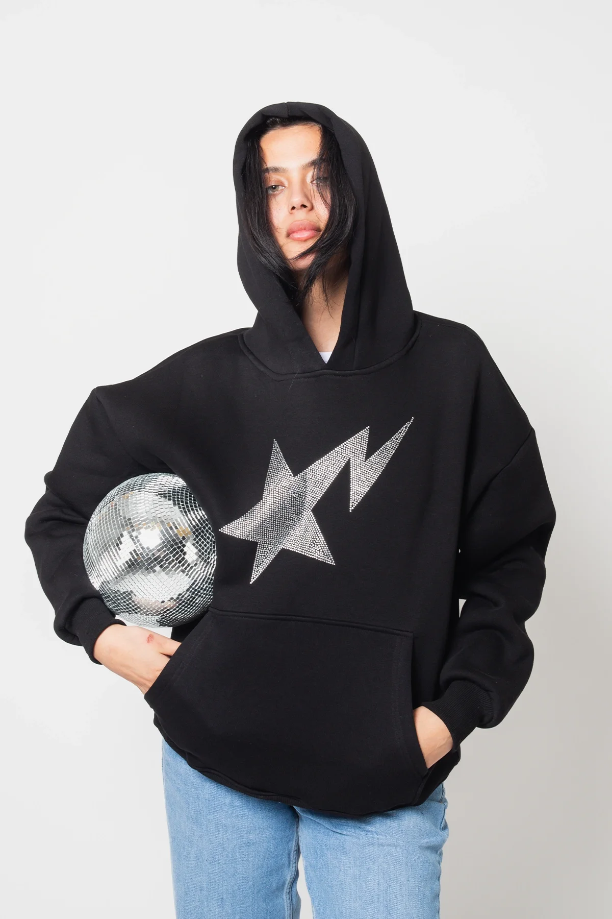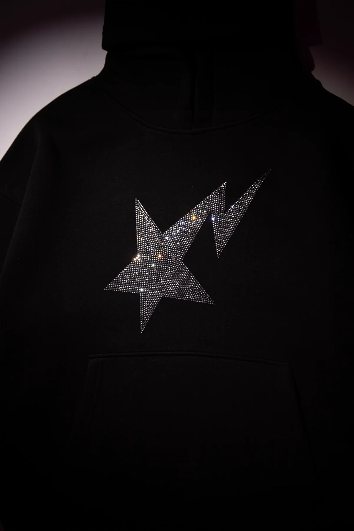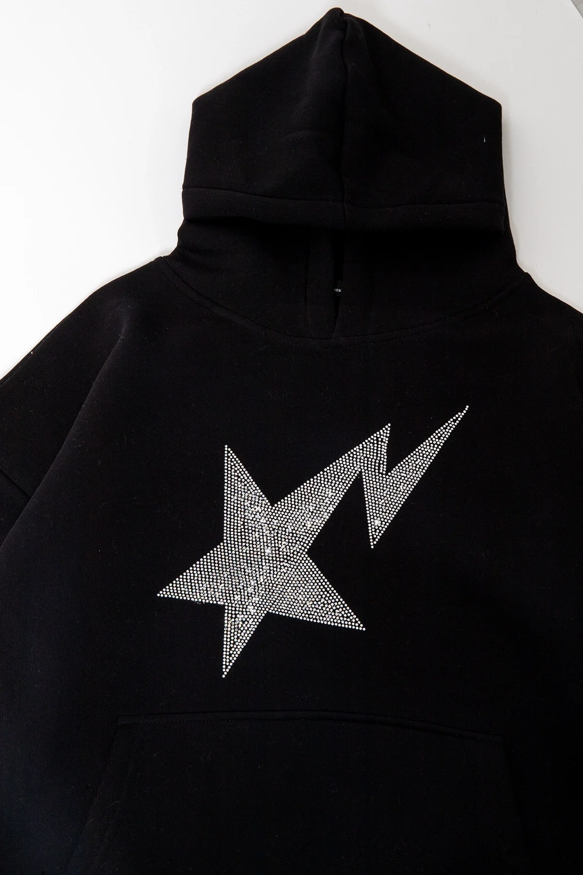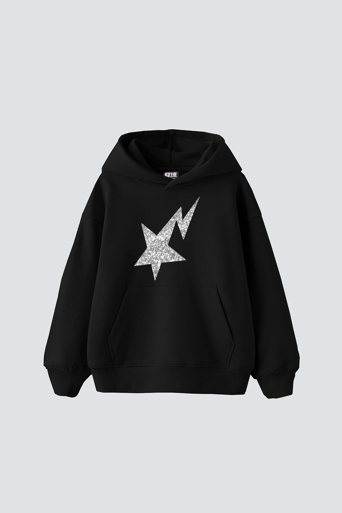 SHİNİNG STAR TAŞ BASKILI OVERSİZE UNİSEX PREMİUM SİYAH HOODİE