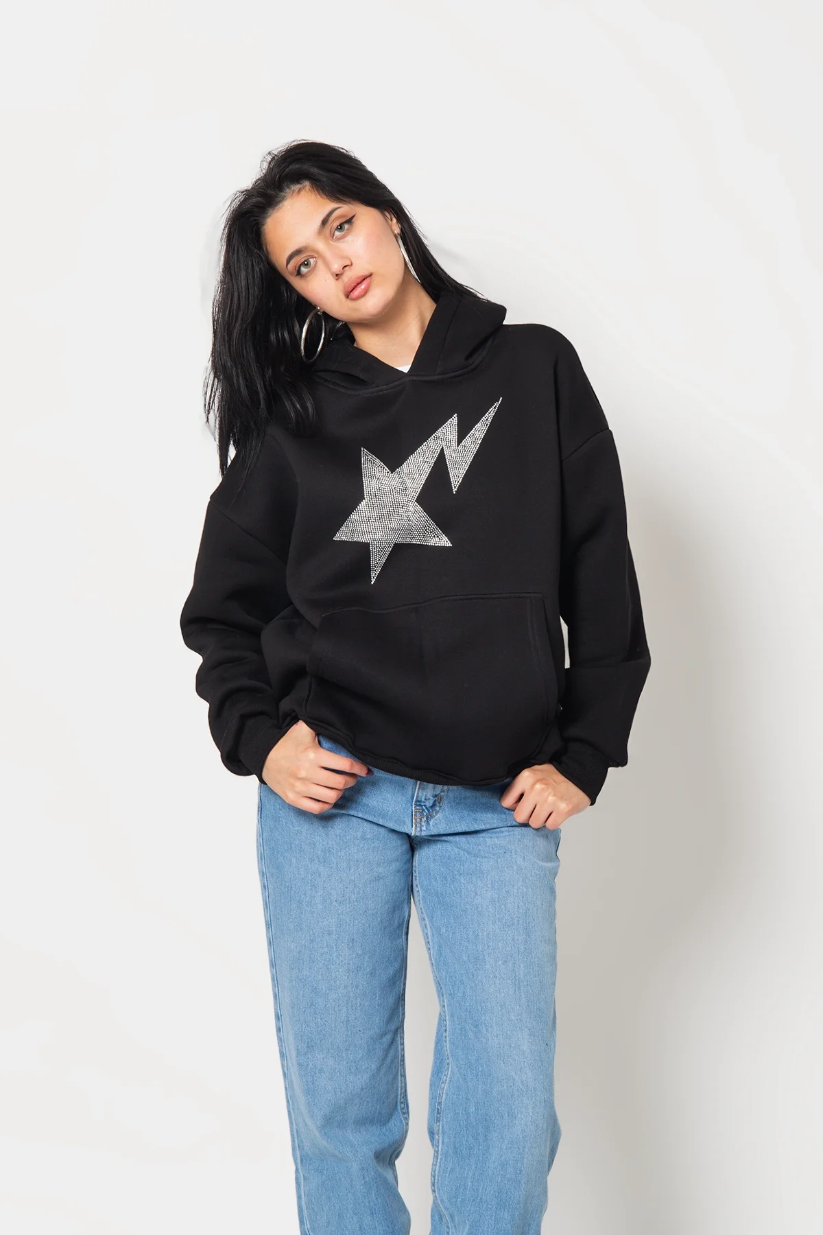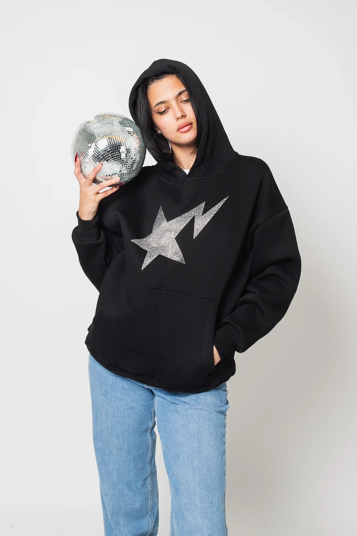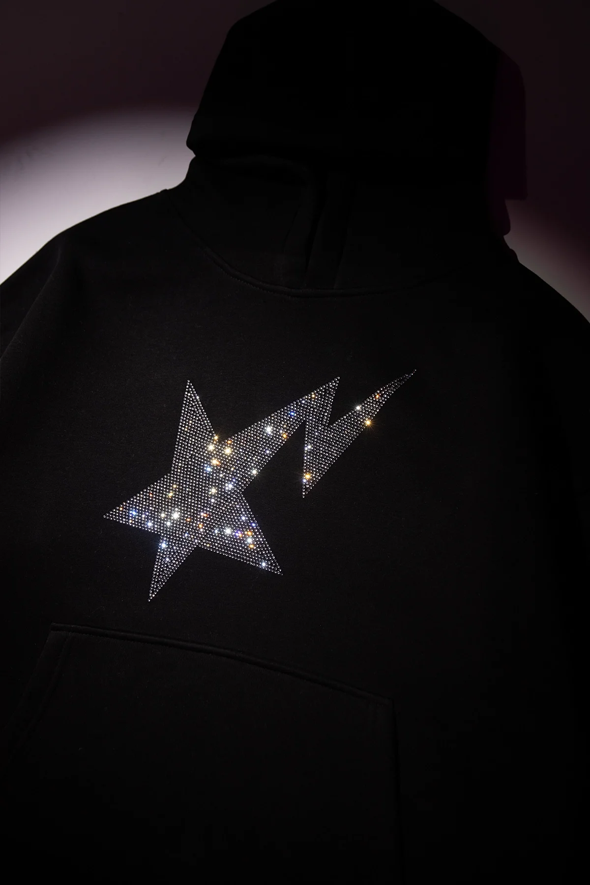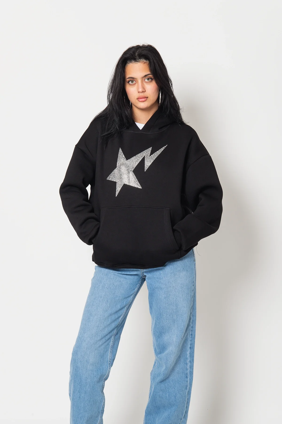 SHİNİNG STAR TAŞ BASKILI OVERSİZE UNİSEX PREMİUM SİYAH HOODİE