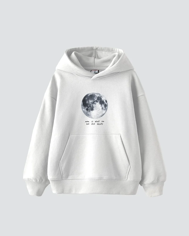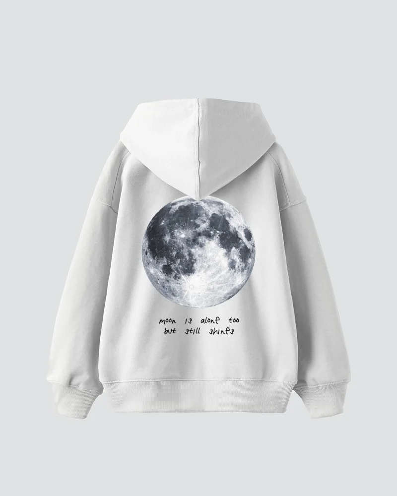 Moon İs Alone Baskılı Oversize Unisex Beyaz Hoodie
