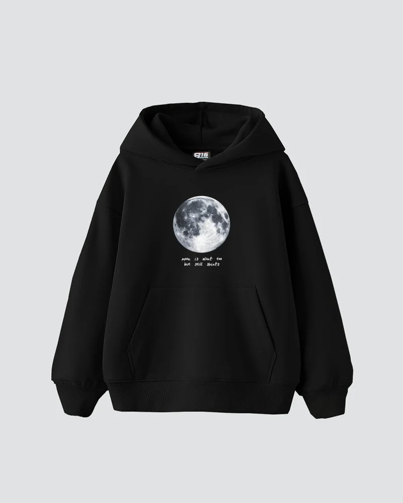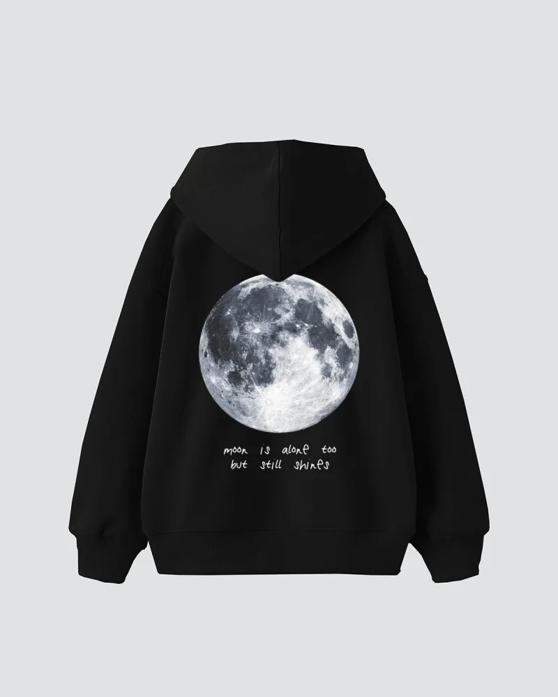 Moon İs Alone Baskılı Oversize Unisex Siyah Hoodie