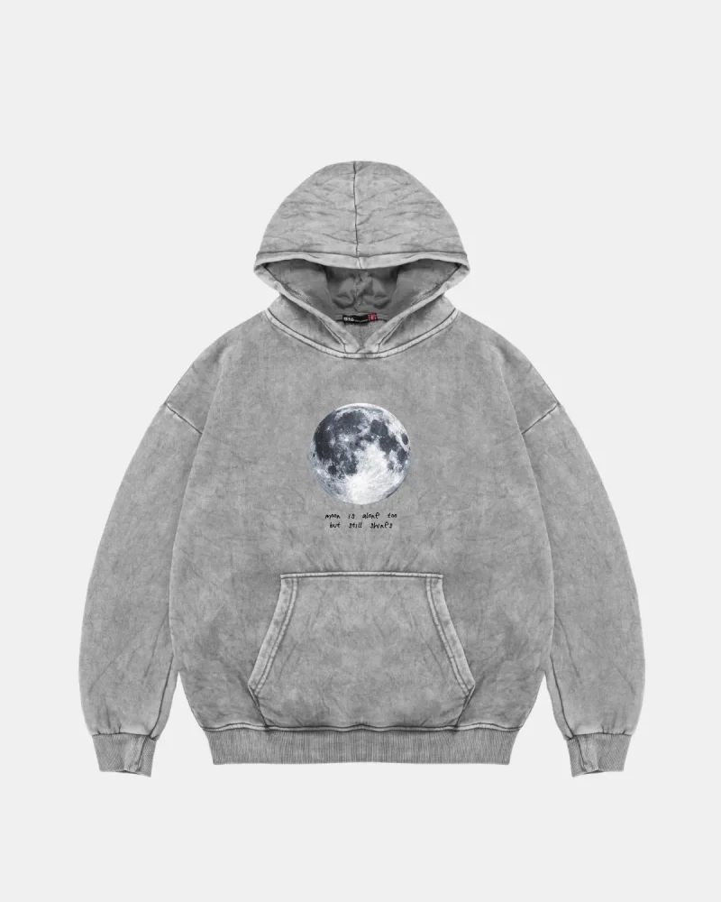 Moon İs Alone Baskılı Oversize Unisex Yıkamalı Beyaz Hoodie