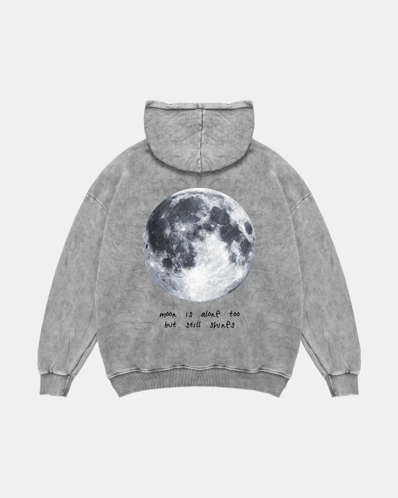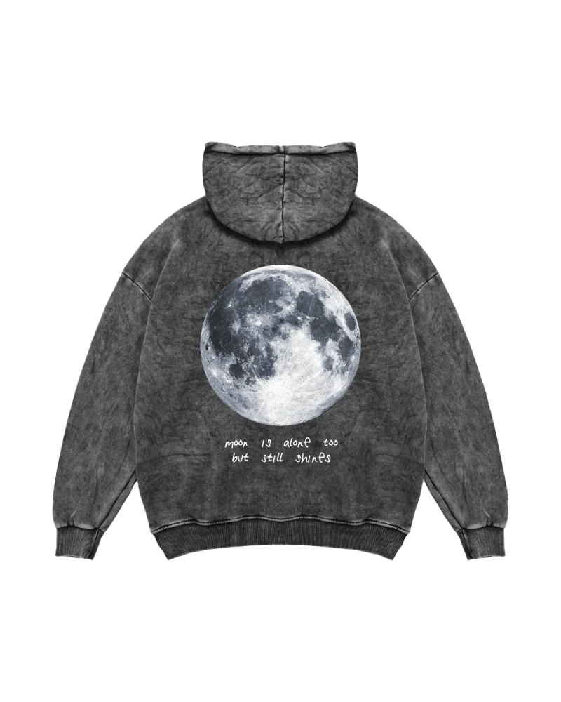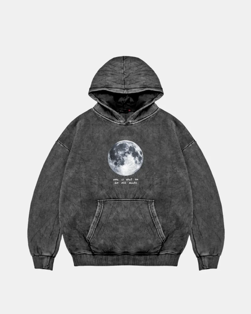 Moon İs Alone Baskılı Oversize Unisex Yıkamalı Siyah Hoodie