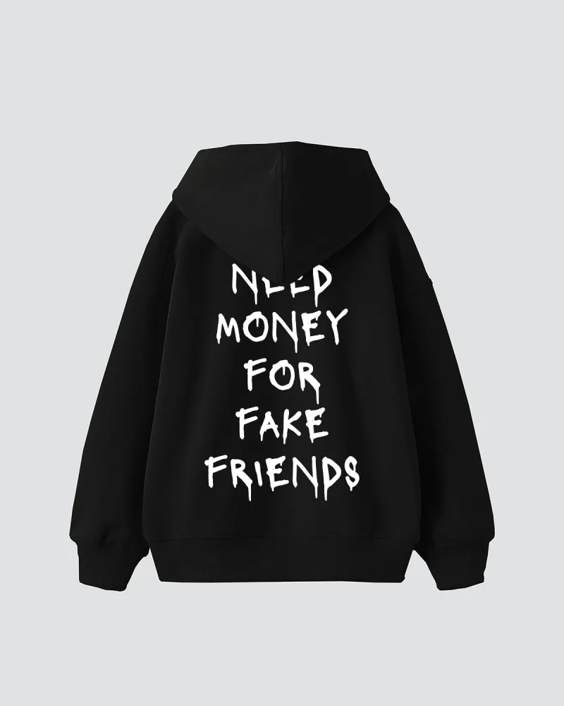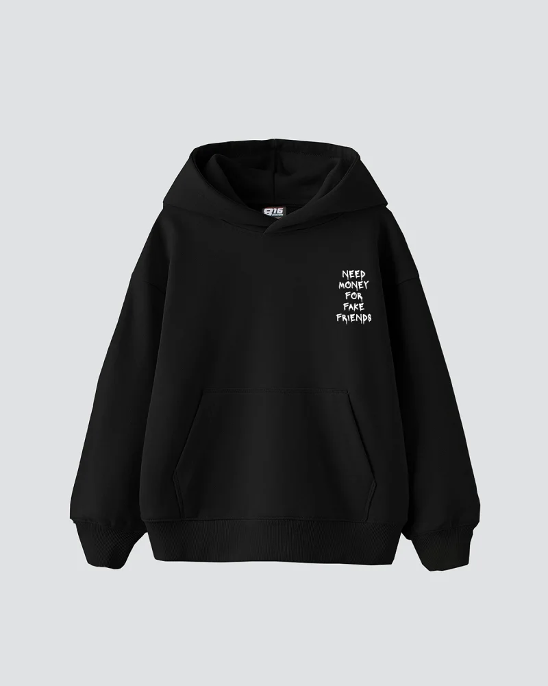 Need Money for Fake Friends Baskılı Oversize Unisex Siyah Hoodie