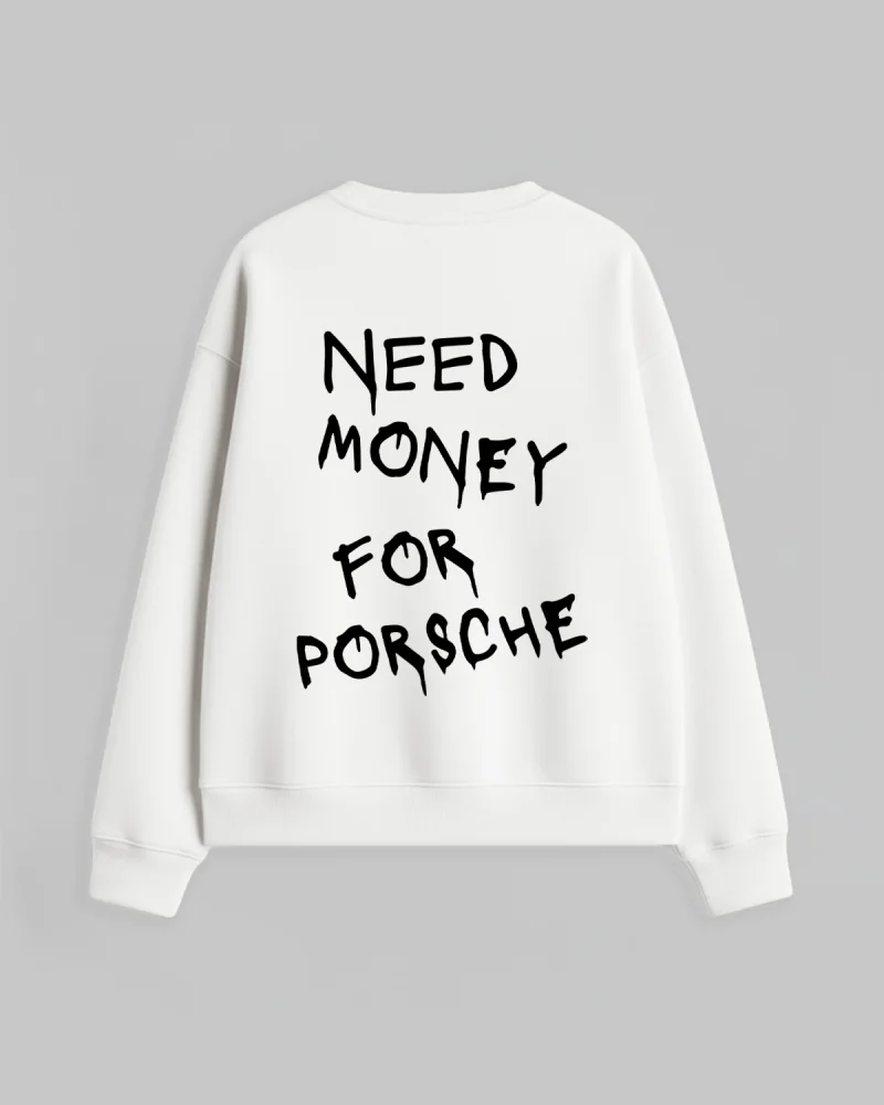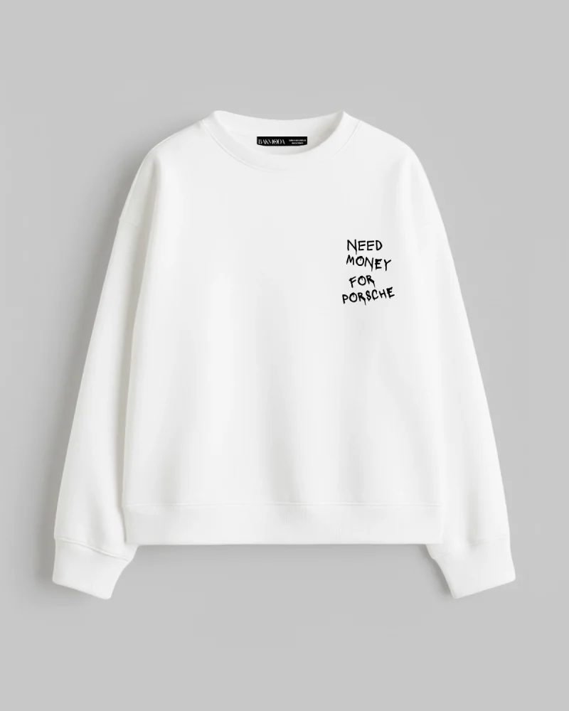 Need Money For Porsche Baskılı Kapüşonsuz Relaxed Fit Kadın Beyaz Sweatshirt