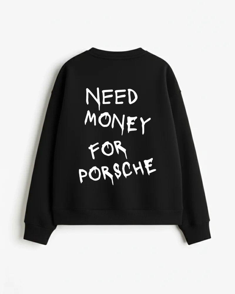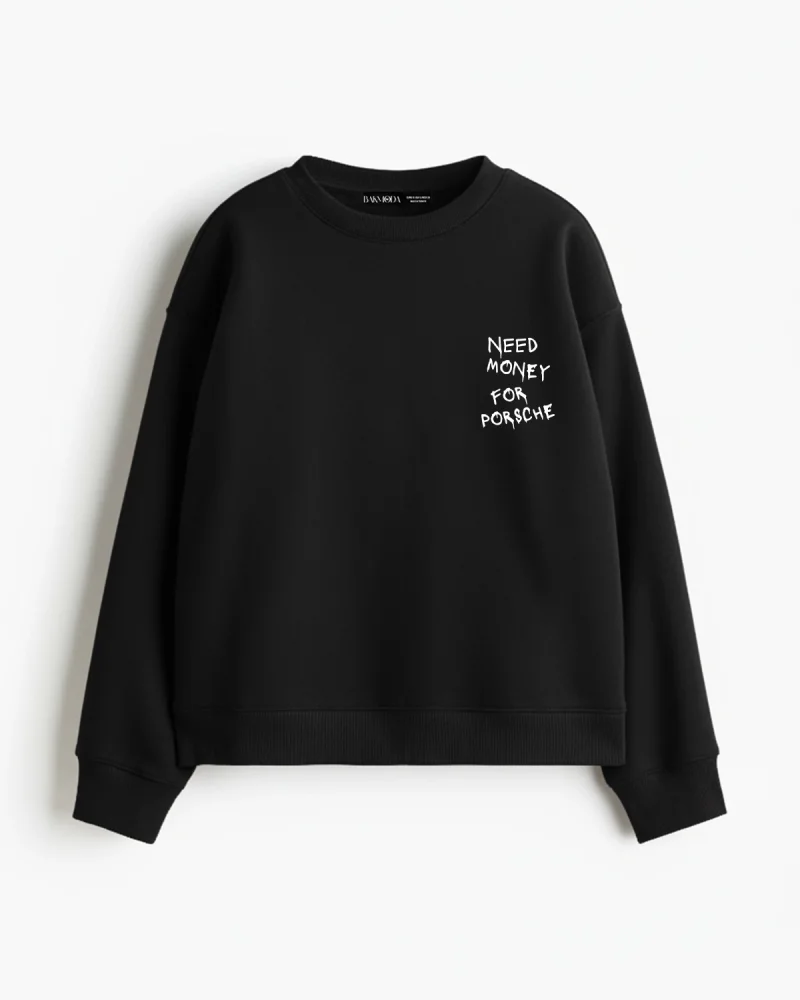 Need Money For Porsche Baskılı Kapüşonsuz Relaxed Fit Kadın Siyah Sweatshirt