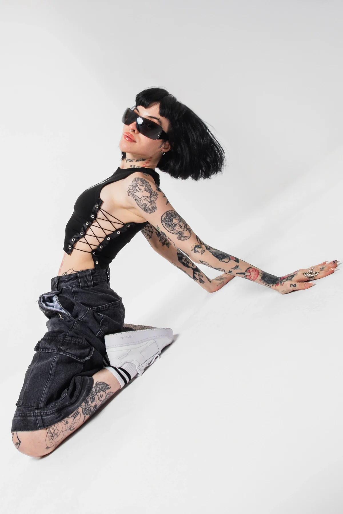Işıltılı ve özgün detaylarıyla stilinize fark katacak Star Nakış İşlemeli Yandan Bağlamalı Siyah Crop Top, modern çizgileriyle öne çıkmak isteyenler için tasarlandı.