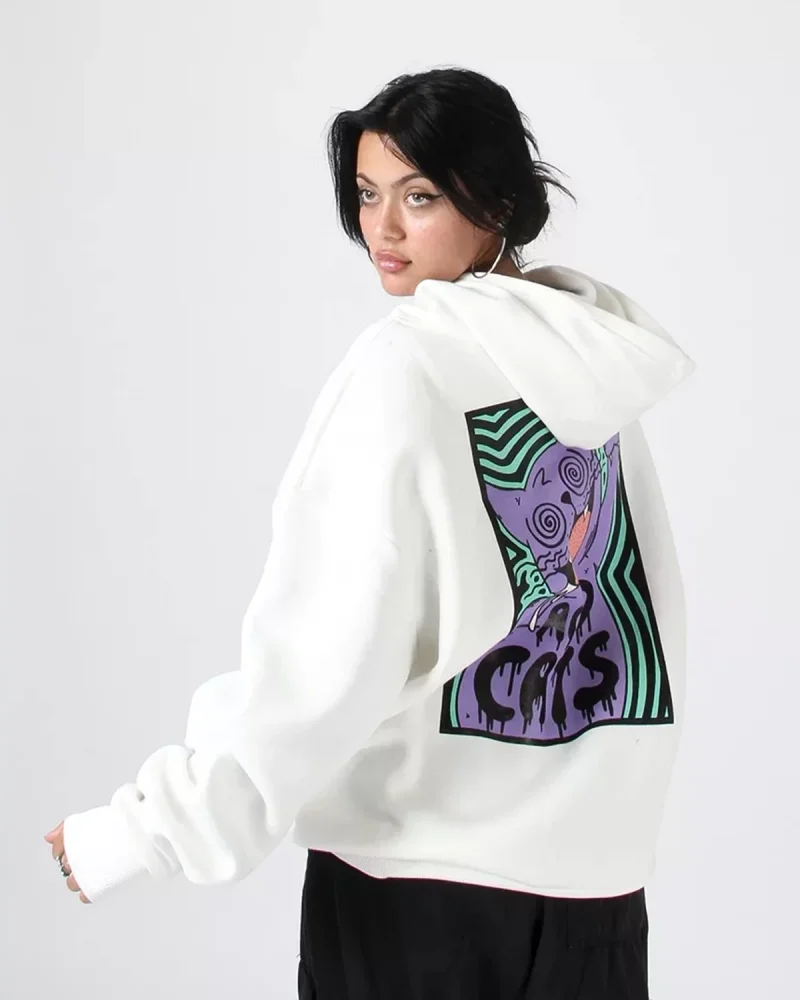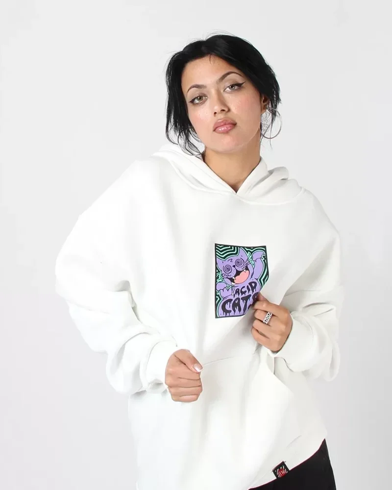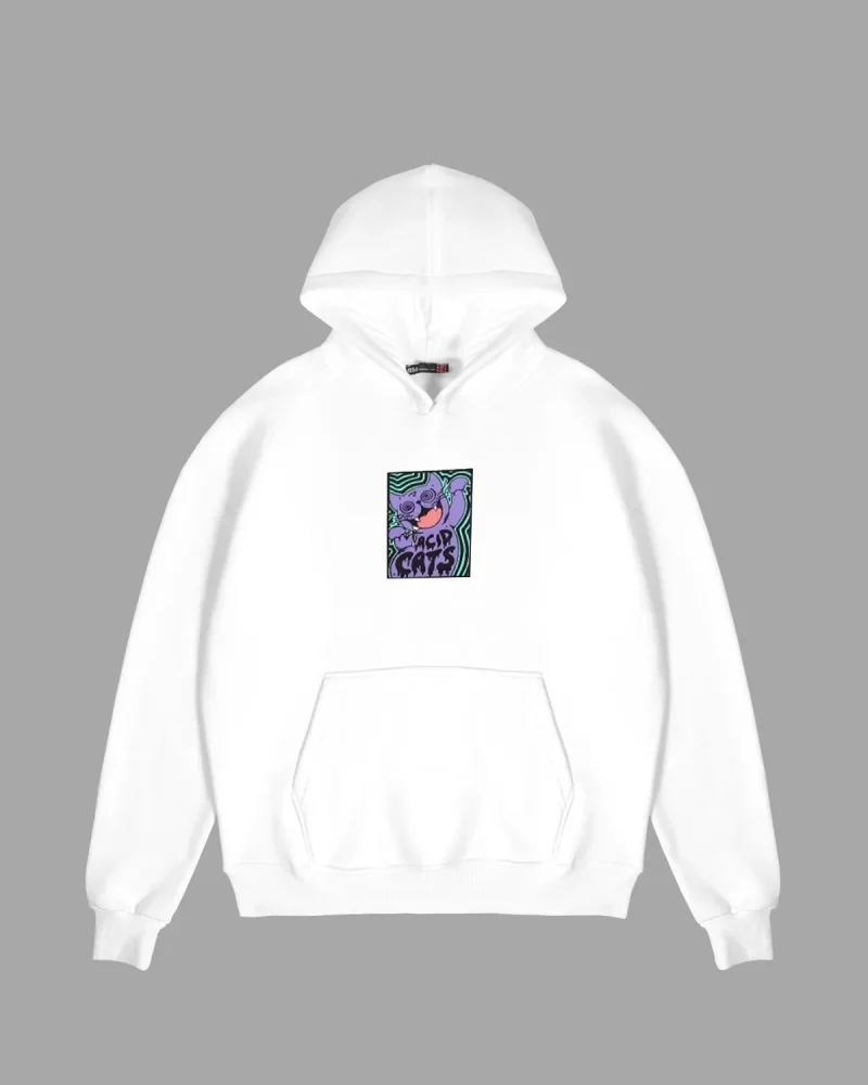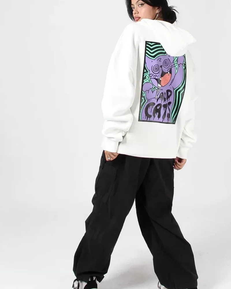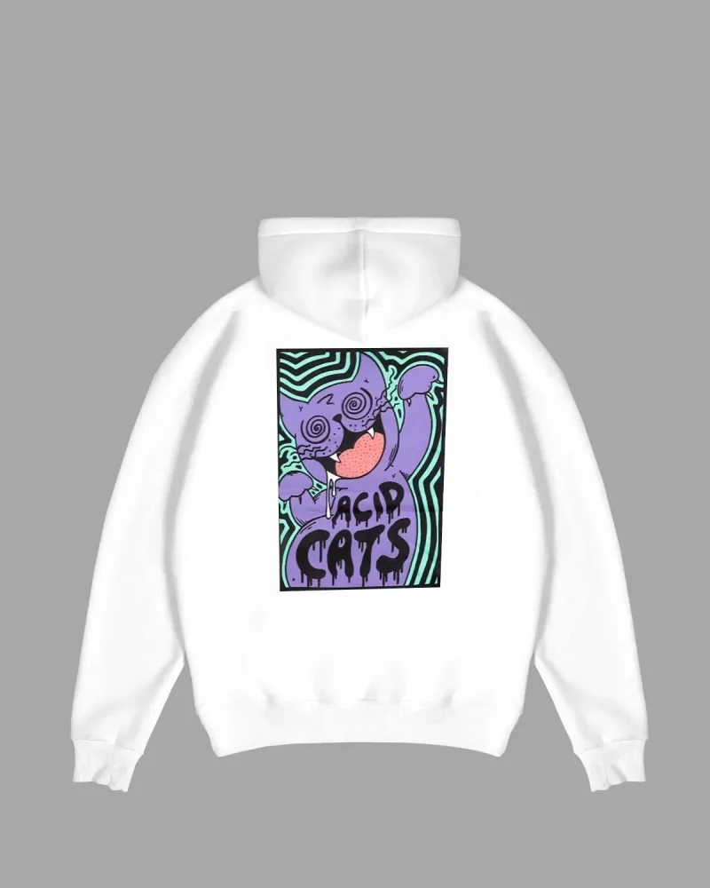 Acid Cat Sırt Baskılı Beyaz Oversize Unisex Kapüşonlu Sweatshirt