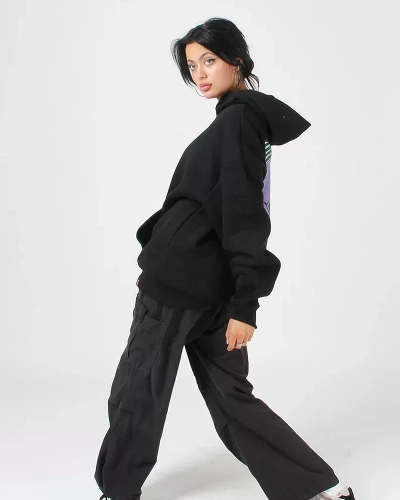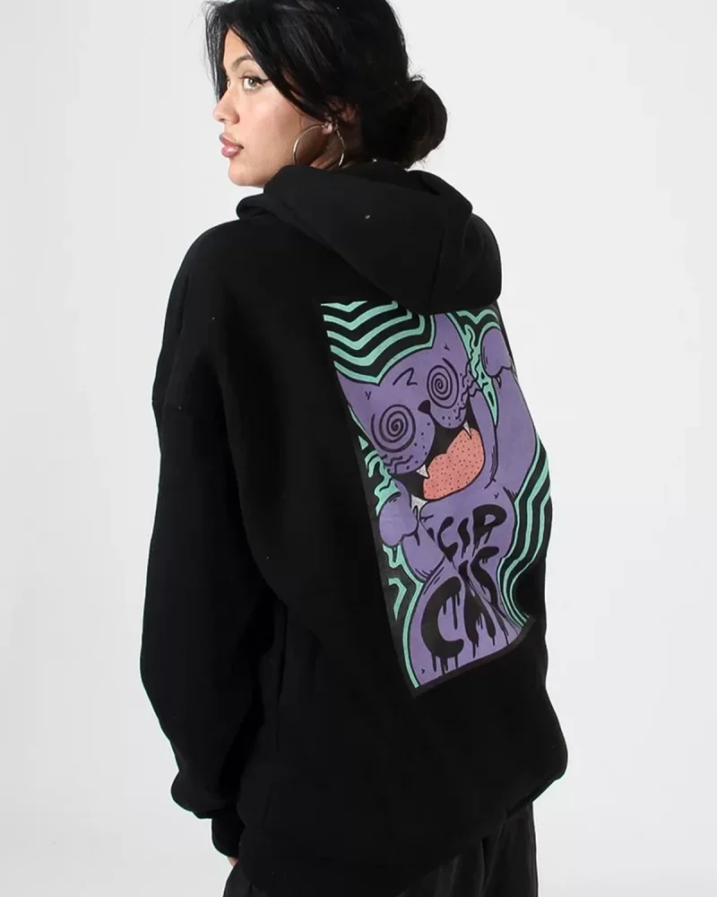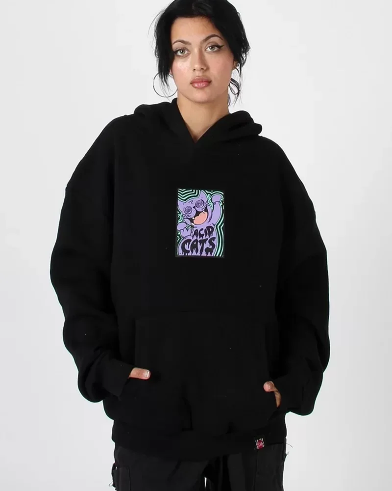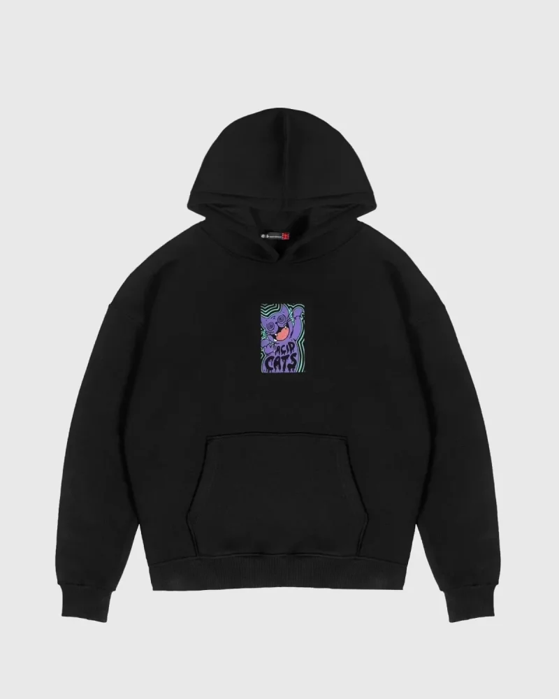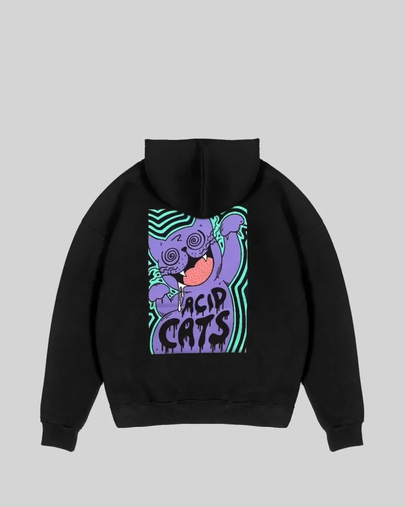 Acid Cat Sırt Baskılı Siyah Oversize Unisex Kapüşonlu Sweatshirt