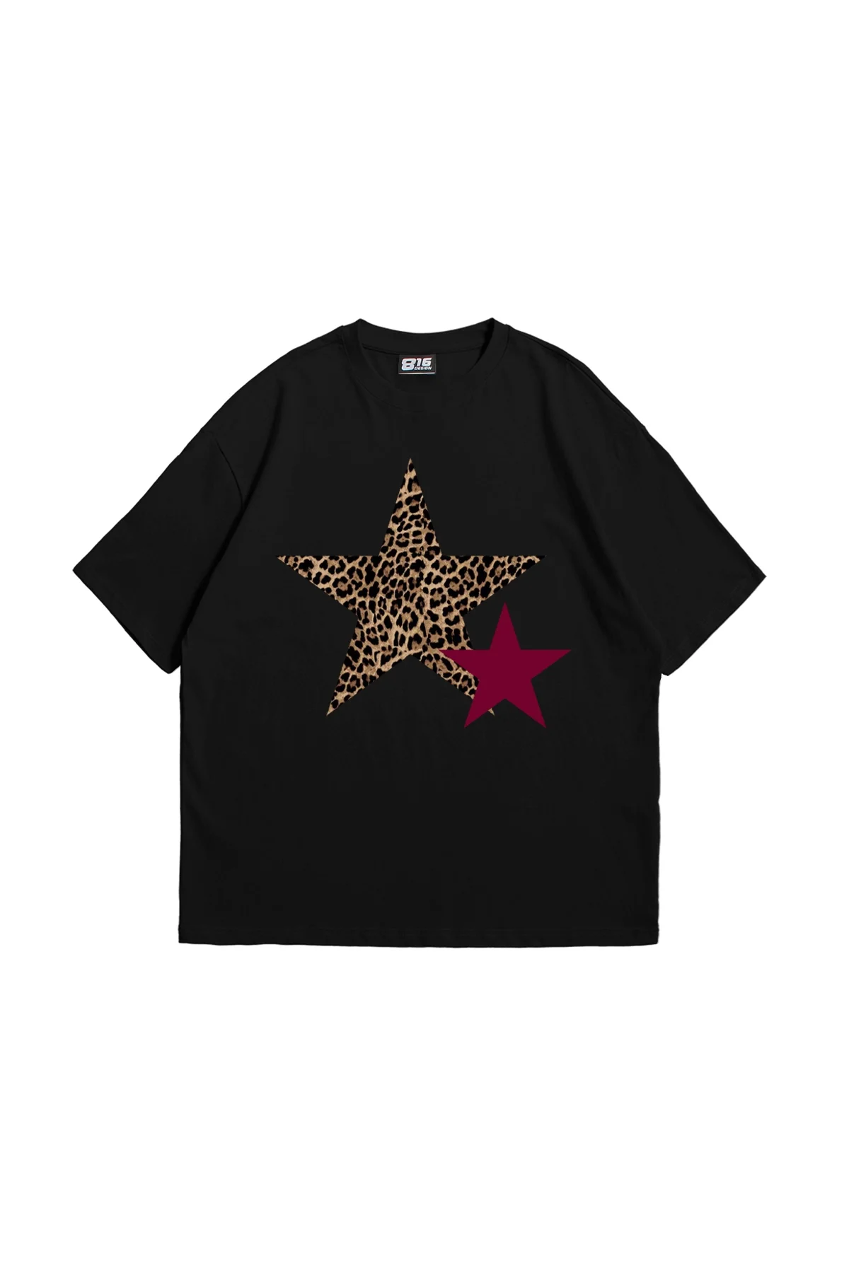 Y2K LEOPAR STARZ BASKILI OVERSİZE UNİSEX SİYAH TSHİRT