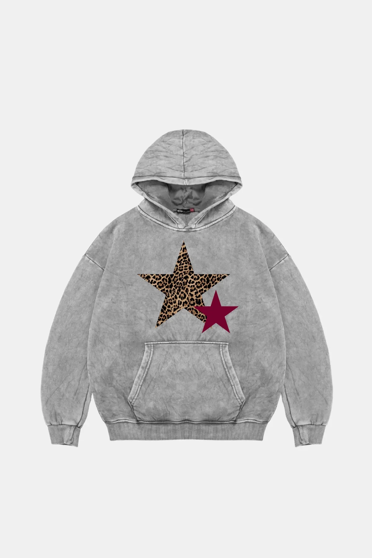 Y2K LEOPAR STARZ BASKILI OVERSİZE UNİSEX YIKAMALI BEYAZ HOODİE