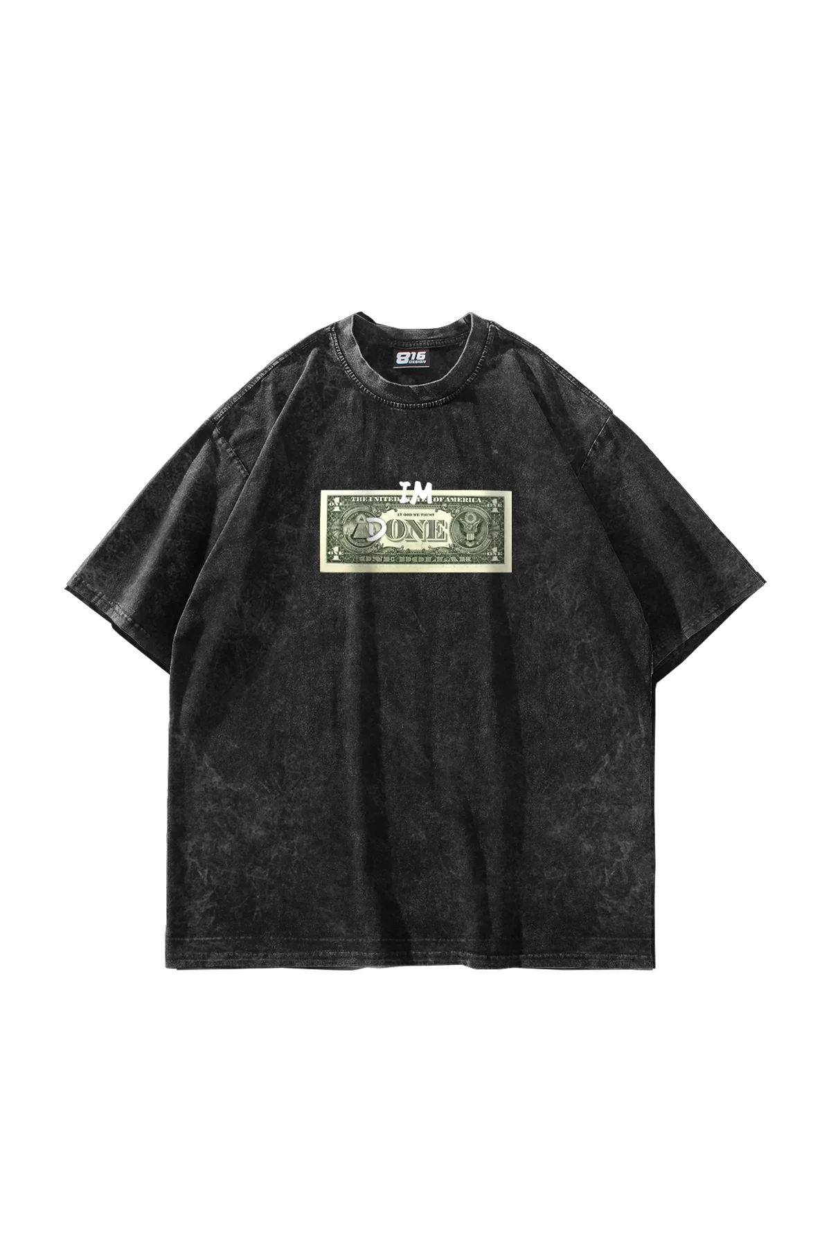 DOLLAR BASKILI OVERSİZE UNİSEX YIKAMALI SİYAH TSHİRT