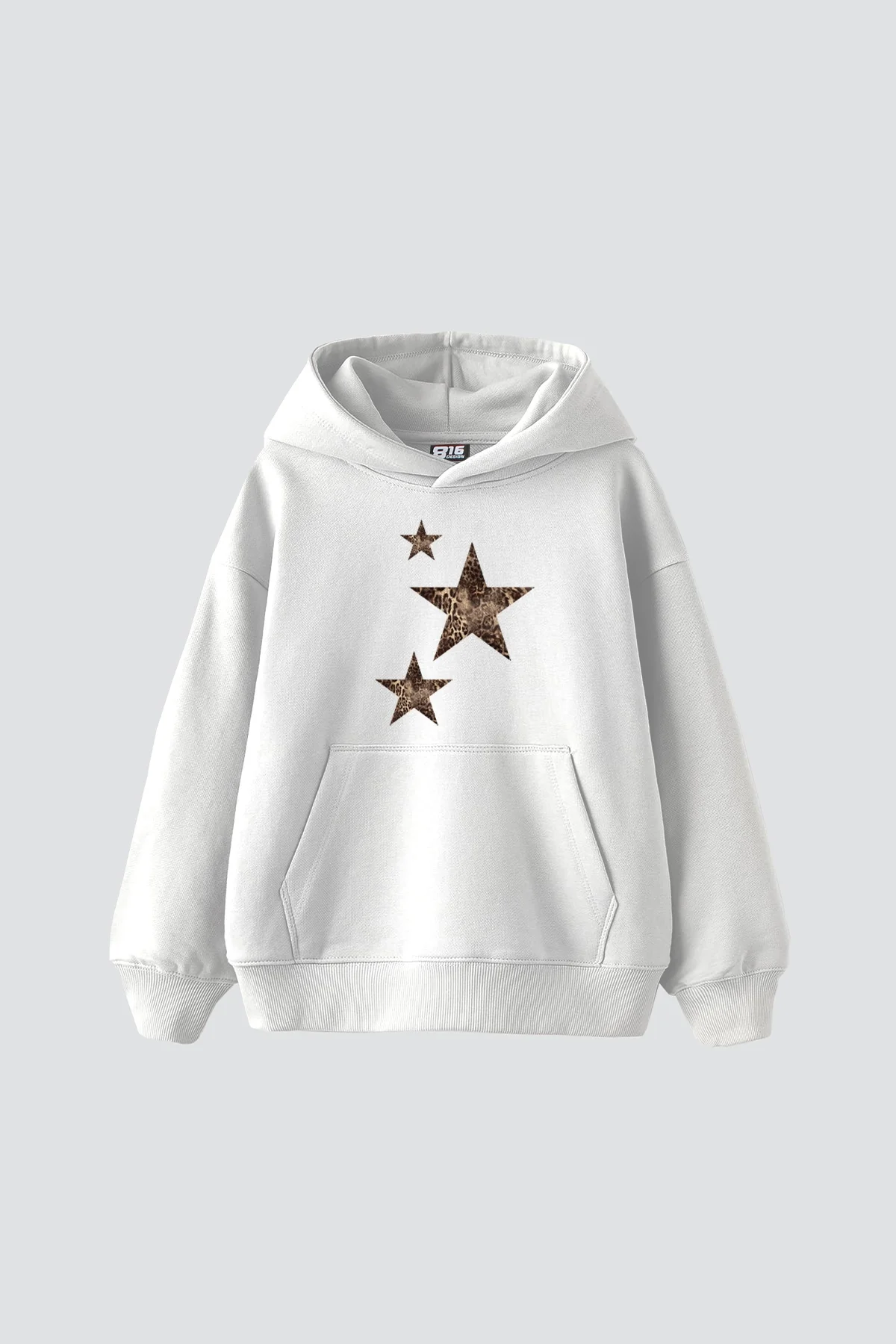 Leopar Yıldız Baskılı Oversize Unisex Beyaz Hoodie