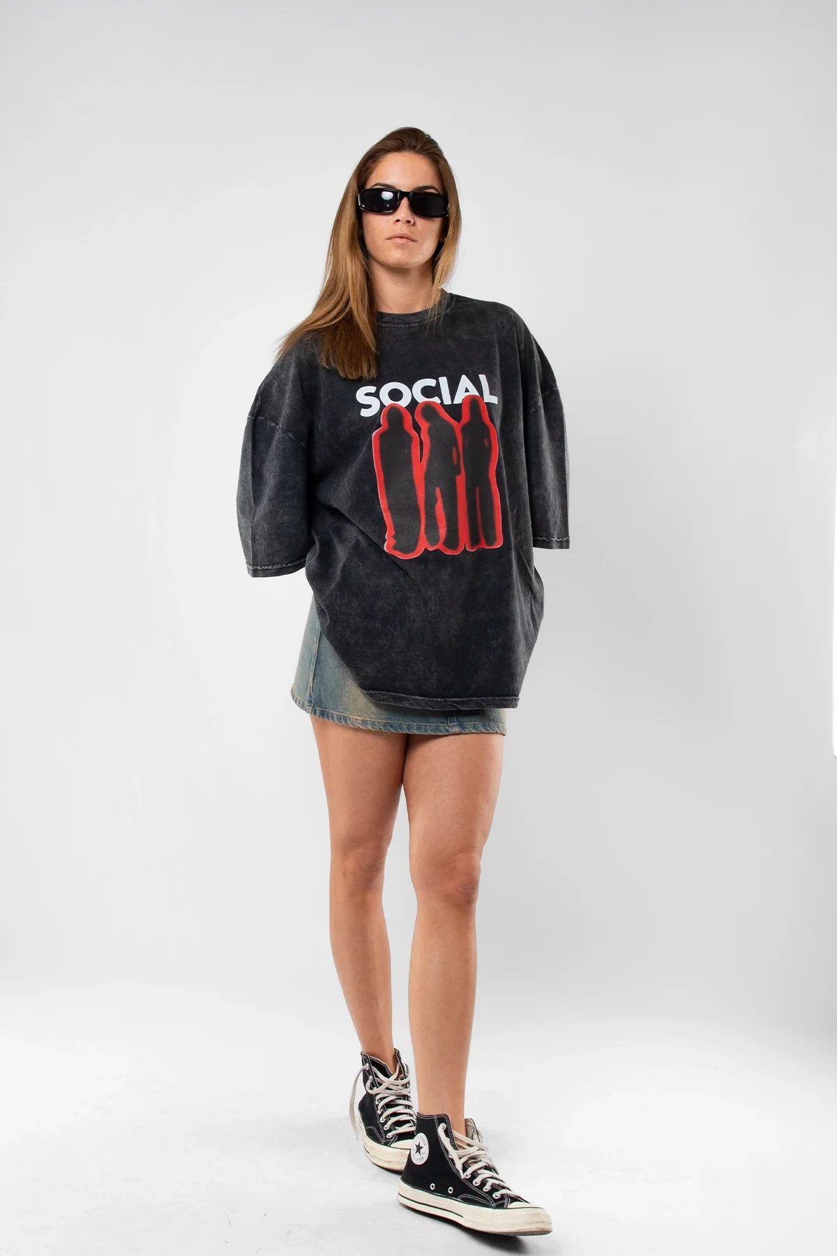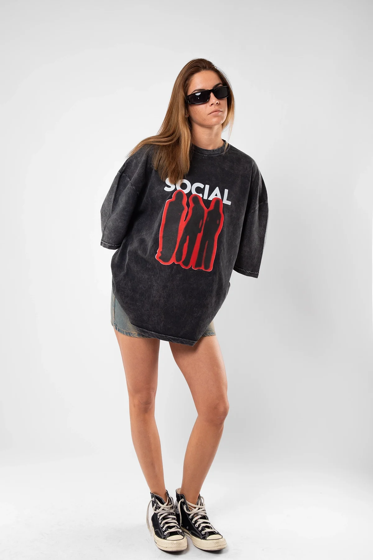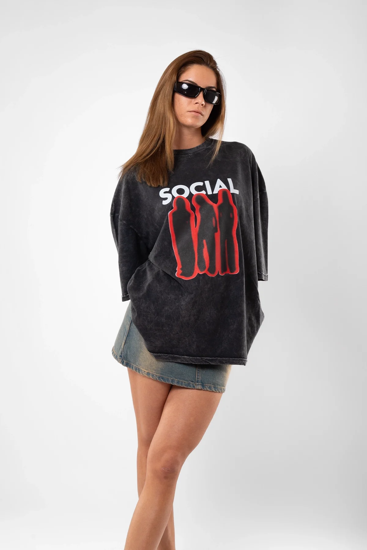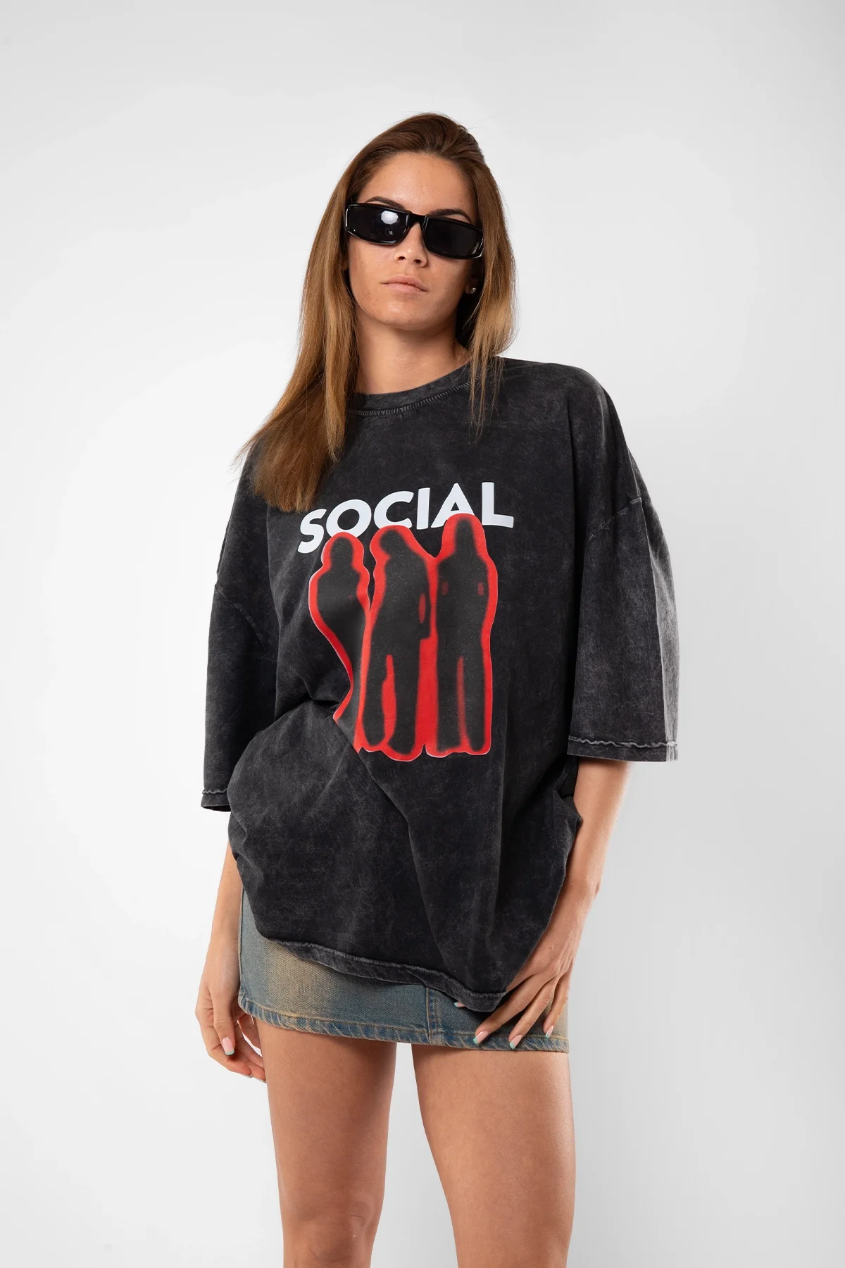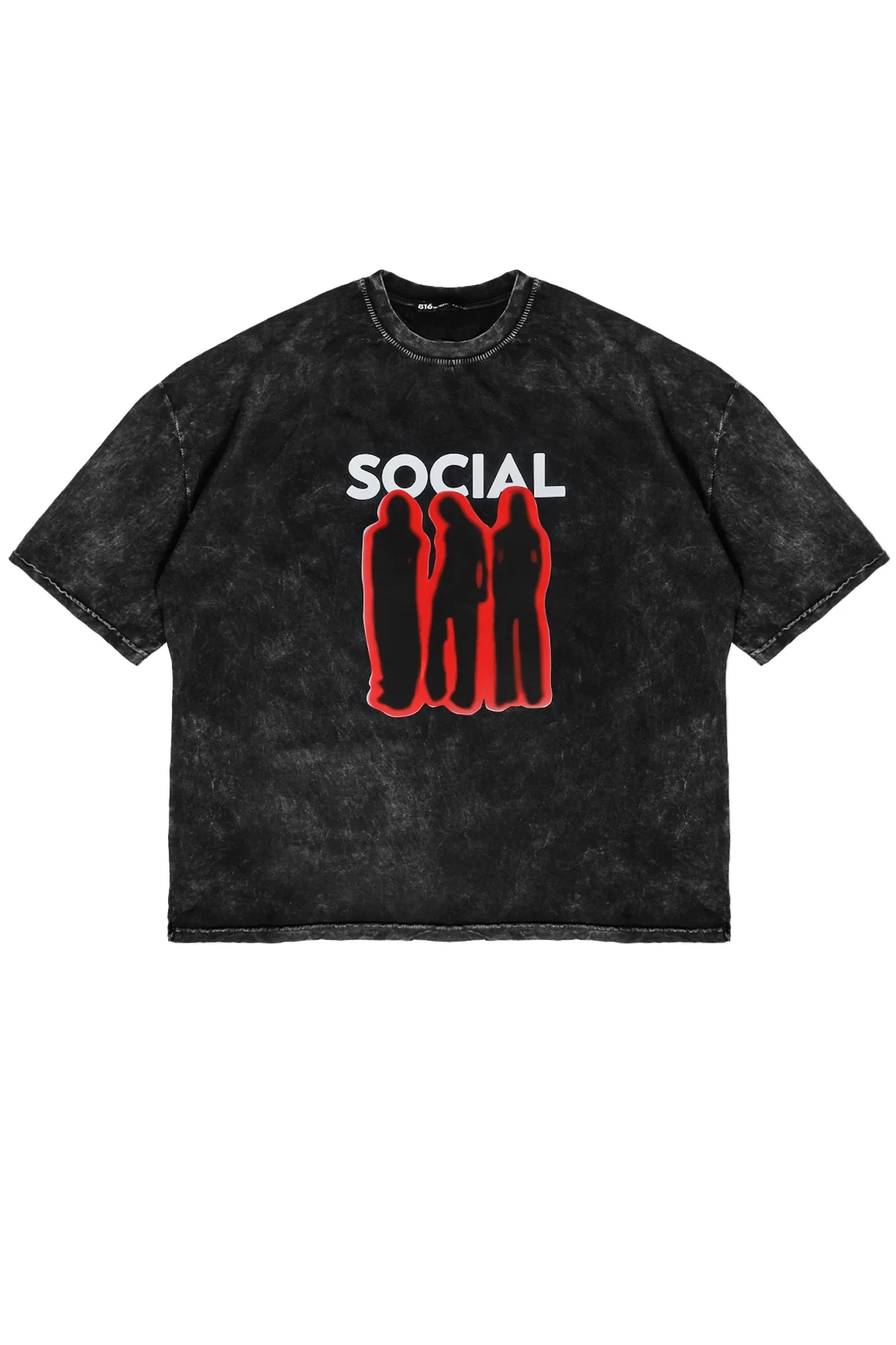 SOCİAL BASKILI YIKAMALI SİYAH UNİSEX OVERSİZE TSHİRT