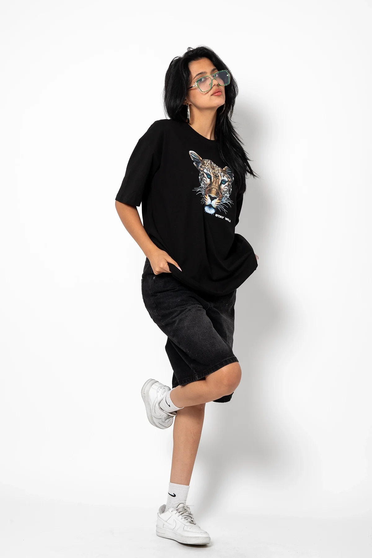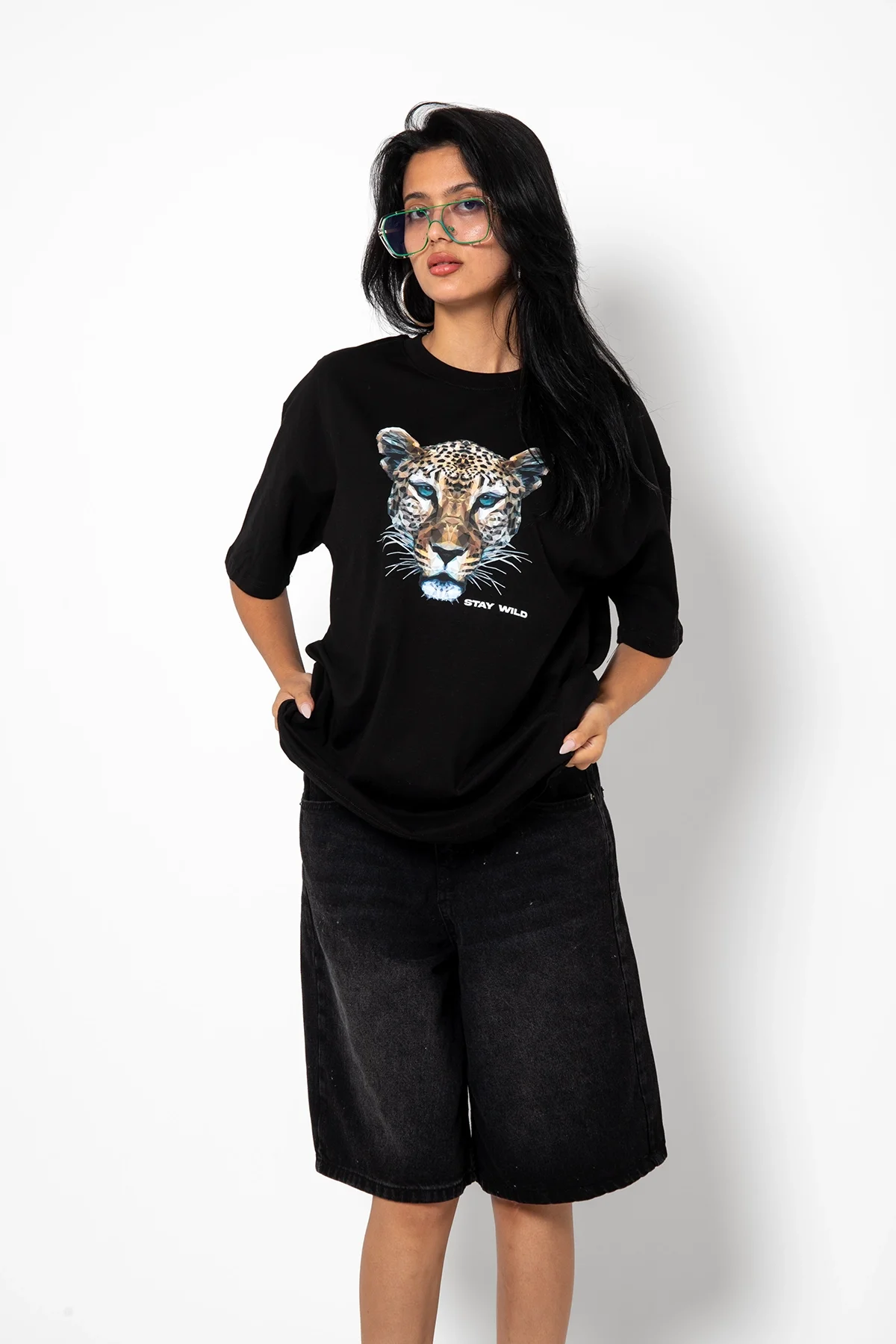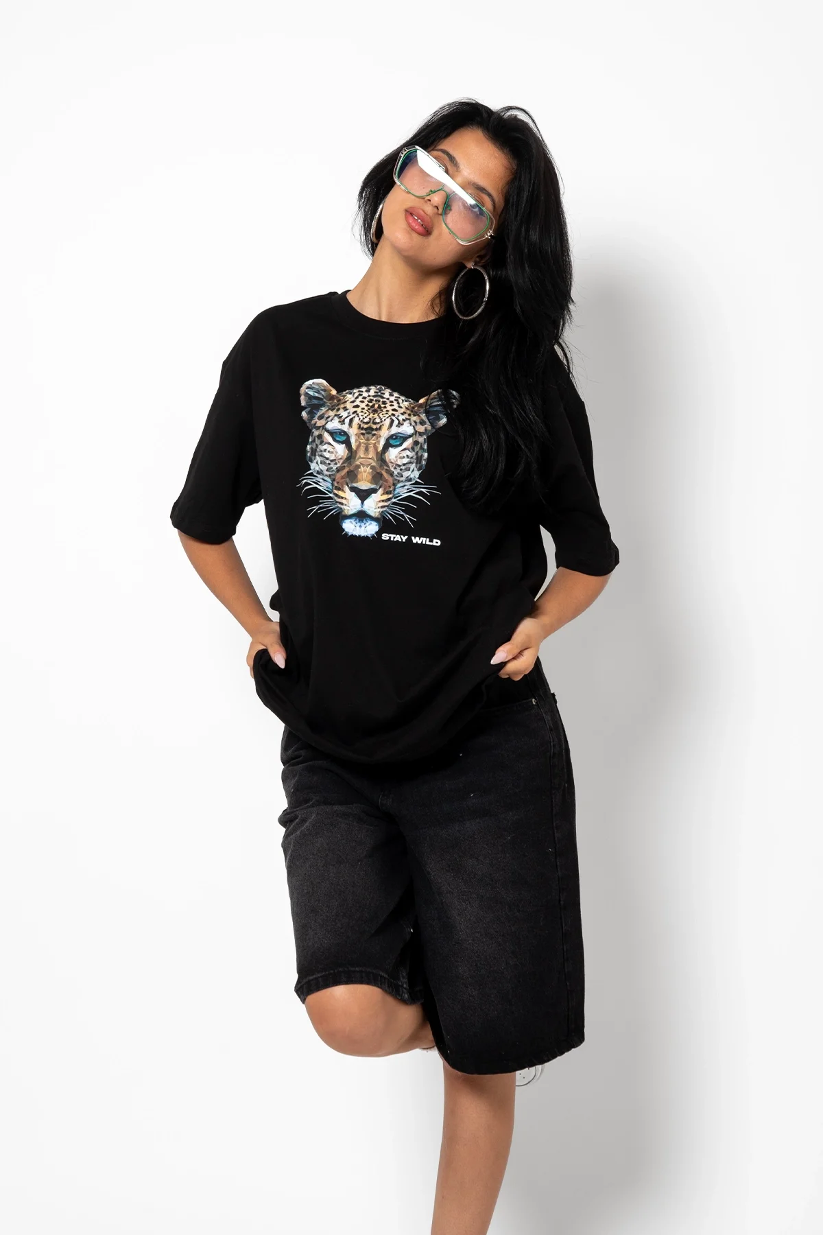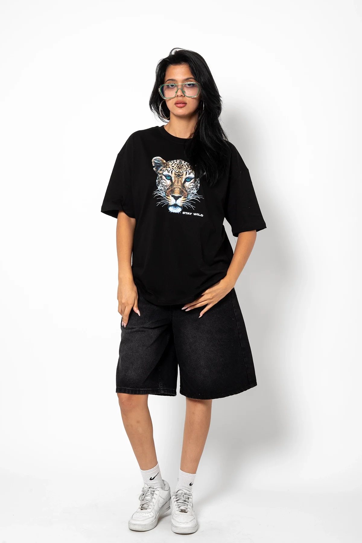STAY WİLD LEOPAR SİLUET BASKILI OVERSİZE UNİSEX SİYAH TSHİRT
