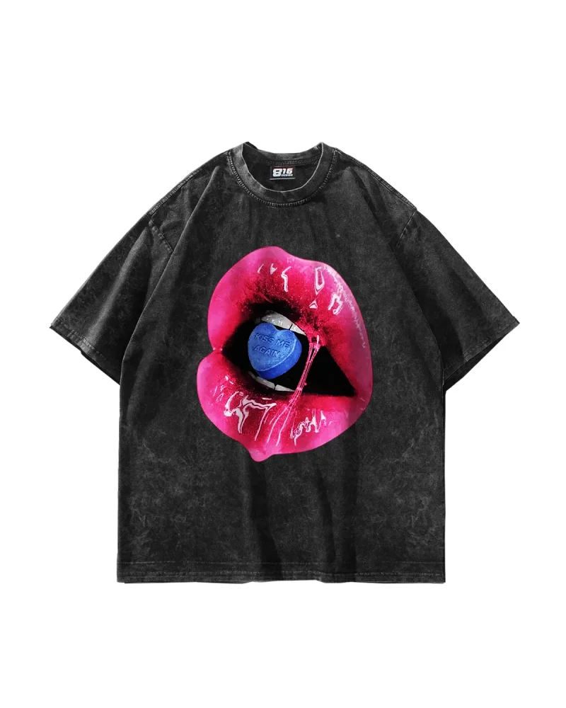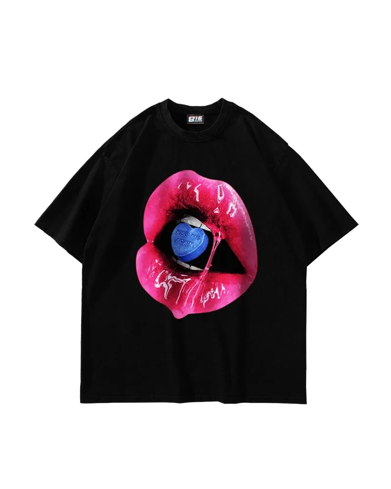 Kiss Me Again Baskılı Oversize Unisex Yıkamalı Siyah Tshirt