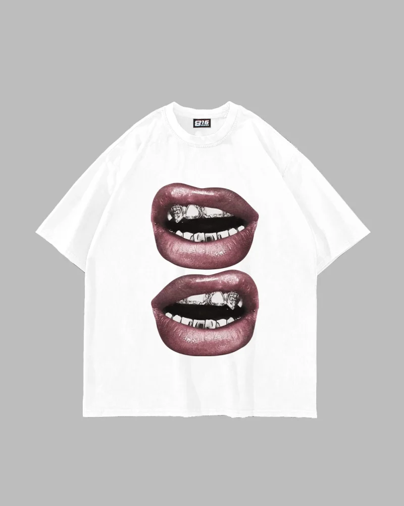 V2 Lip Teeths Baskılı Oversize Unisex Beyaz Tshirt