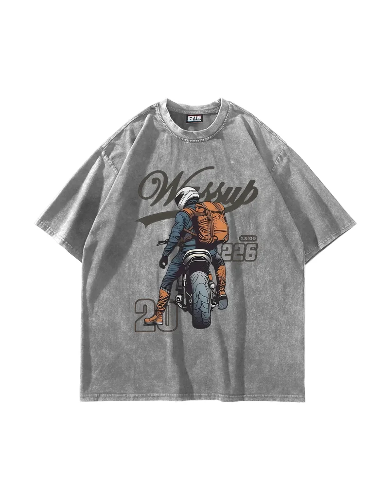 Motor Rider Baskılı Oversize Unisex Yıkamalı Beyaz Tshirt
