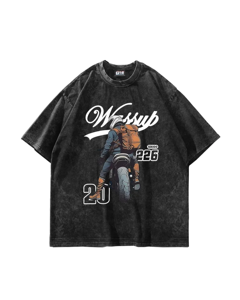 Motor Rider Baskılı Oversize Unisex Yıkamalı Siyah Tshirt