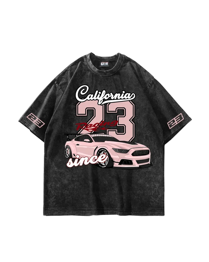 California Racing Baskılı Oversize Unisex Yıkamalı Siyah Tshirt