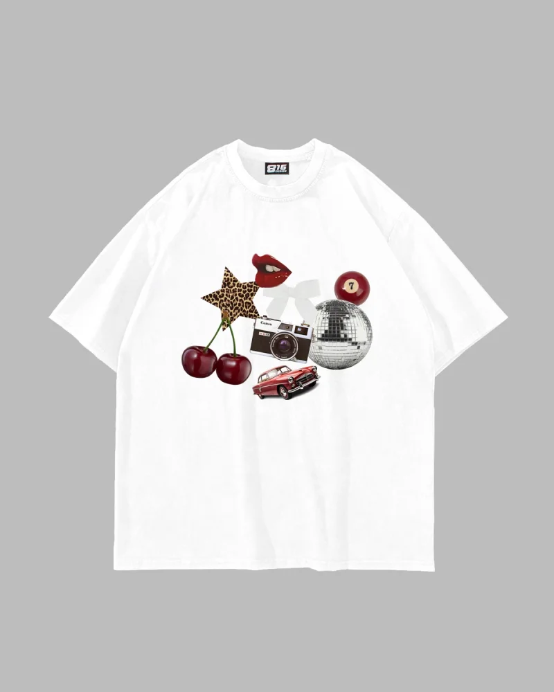 Cherry & Disco Vibes Baskılı Oversize Unisex Beyaz Tshirt