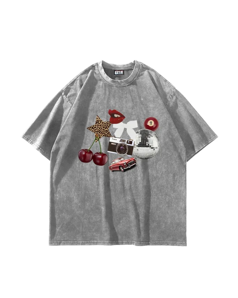 Cherry & Disco Vibes Baskılı Oversize Unisex Yıkamalı Beyaz Tshirt