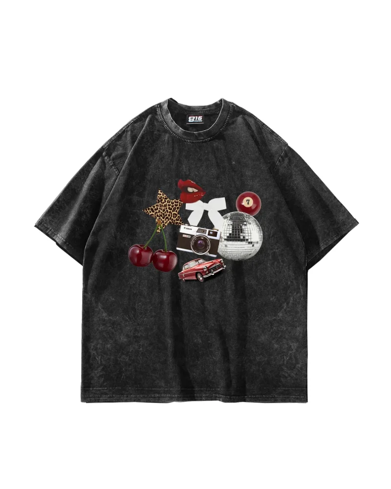 Cherry & Disco Vibes Baskılı Oversize Unisex Yıkamalı Siyah Tshirt
