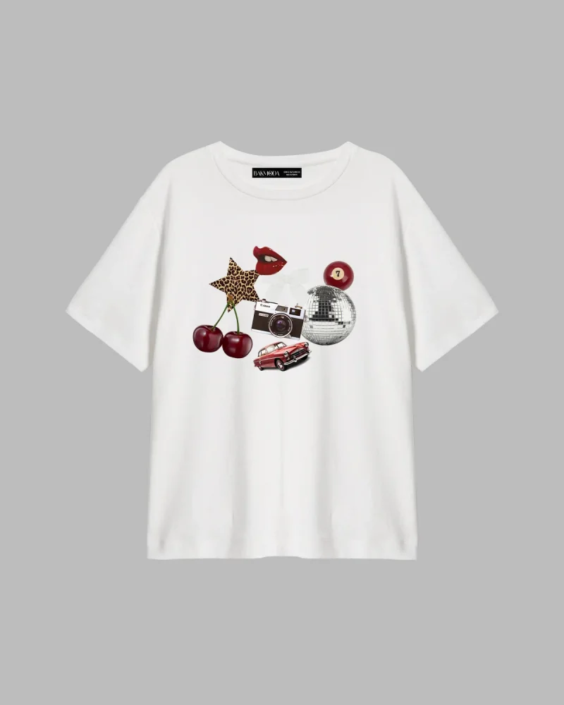 Cherry & Disco Vibes Baskılı Relaxed Fit Beyaz Kadın Tshirt