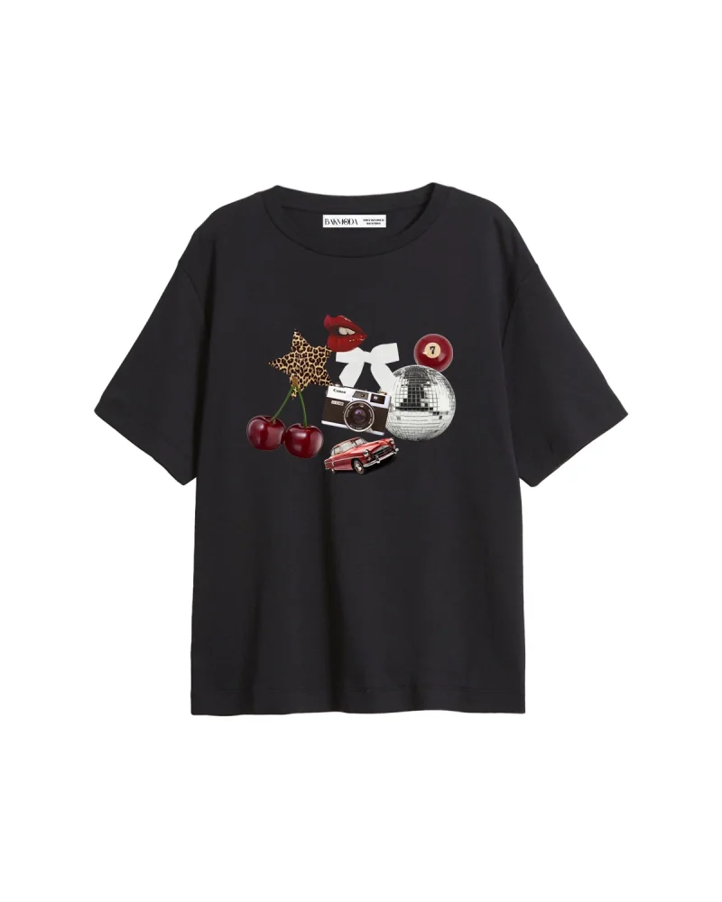 Cherry & Disco Vibes Baskılı Relaxed Fit Siyah Kadın Tshirt