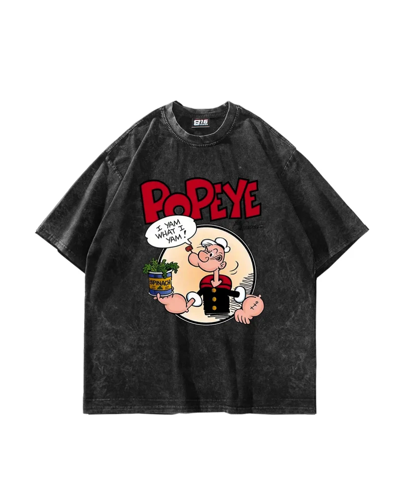 Popeye Baskılı Oversize Unisex Yıkamalı Siyah Tshirt