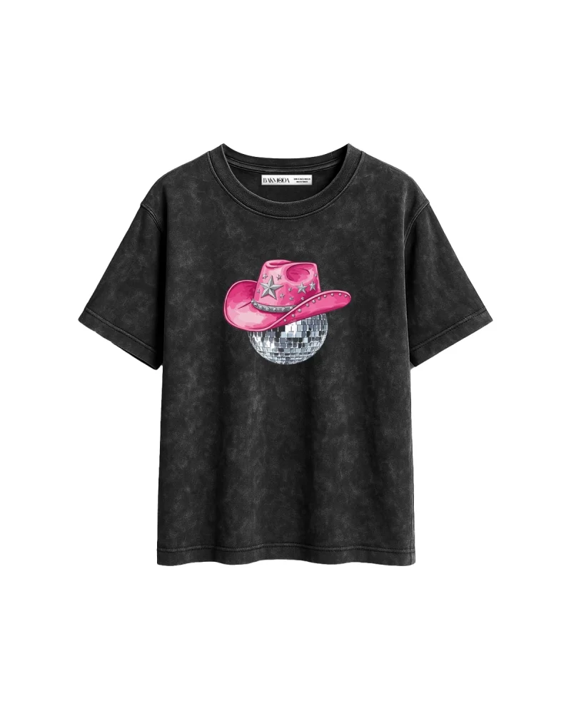 Cow Girl Baskılı Relaxed Fit Yıkamalı Siyah Kadın Tshirt