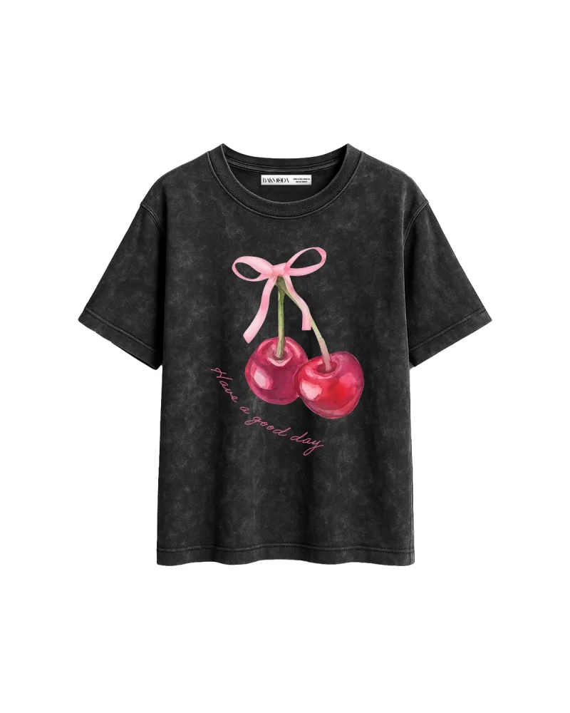 Have A Good Day Baskılı Relaxed Fit Yıkamalı Siyah Kadın Tshirt
